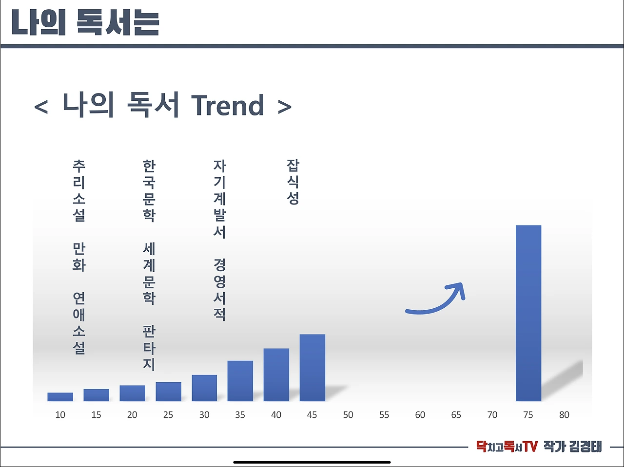 살펴보았더니 내 독서는 10대에는 추리소설과 만화책 그리고 연애소설이 주를 이뤘다. 20대에는 대학 도서관에 열심히 책을 빌려다 읽었는데 주로 800번대의 책을 섭렵했다. 그 시기가 아마도 내 독서력이 폭발하던 시기가 아닐까? 30대 취직 후 나는 발전해야 한다는 생각에 한 번도 읽으려 생각하지 않았던 자기 계발서를 손에 쥐었다. 그때부터 지금까지 매년 100~150권 정도의 독서를 하고 있다. 그리고 지금 40대 내 독서는 완벽한 잡식성이 되었다. 이제는 한 달에 10권 정도를 목표로 읽어가고 있는데 소설 2권, 자기 계발서 3~4권, 경제경영 및 취미도서 2~3권, 에세이 1편, 의식 도서 1권 정도 정한다. 이렇듯 독서가 완벽한 내 일상의 한 부분으로 자리를 잡았다. 물론 금요일 퇴근 후에는 일상의 루틴을 깨고 티브이 드라마를 보고 영화도 본다. 꿀 같은 시간이라 더 신나고 심취한다. 그리고 토요일/일요일 쉬면서 맞추지 못한 진도를 채우고 더 읽고 싶은 책을 읽으며 가족과 함께 그리고 때로는 혼자 시간을 보낸다.