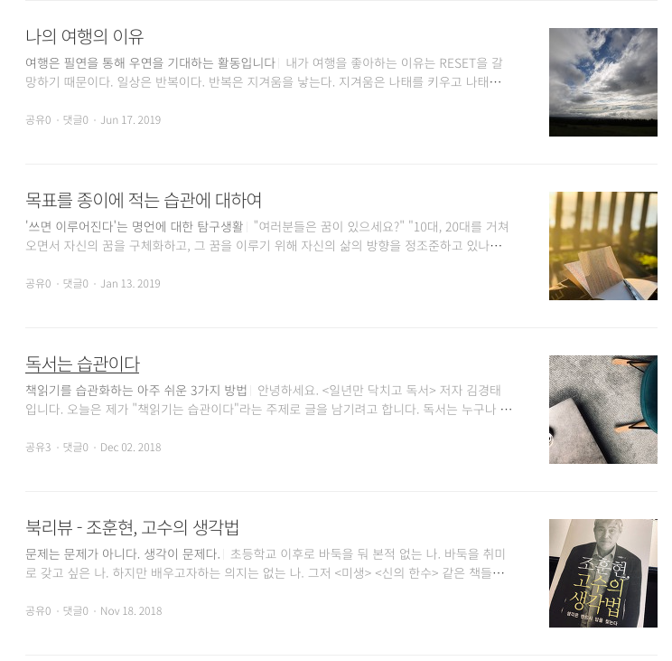 나름대로 체계적으로 글을 써보겠다고 생각을 했었고, <브런치>라는 플랫폼에서는 블로그처럼 어정쩡한 글을 남겨서는 안 된다는 생각에(그래도 작가라는 타이틀을 달아주는 플랫폼이기에) 고민을 거듭하며 글을 썼던 것 같습니다. 몇 가지 주제를 정해서 순서대로 소재를 맞춰가면서 글을 써보았고, 특히 제가 좋아하는 독서나 자기 계발을 중심으로 쓰기도 했습니다. #자기발견 이라는 플랫폼에 맞추어 저를 깊숙이 들여다보는 글도 브런치에 남겼습니다.
