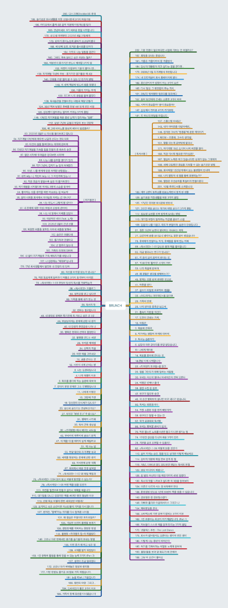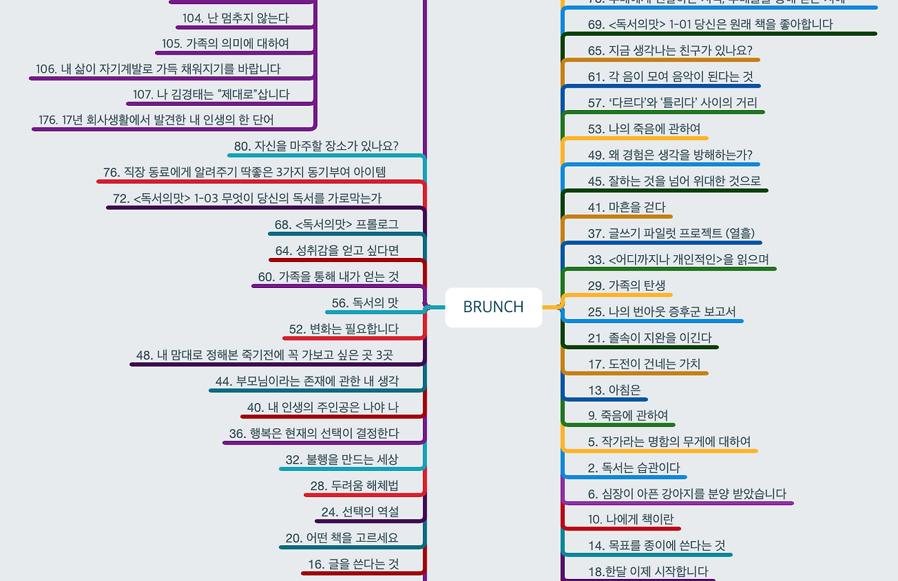 위 사진 무언지 아시겠나요? 제 글 202편의 제목입니다. 그것을 #마인드맵 프로그램에 기록해놓고 현재 카테고리로 나누어보고 있습니다. 글을 다 읽고 5~8개 정도의 카테고리로 나눌 계획을 했고 진행 중입니다.