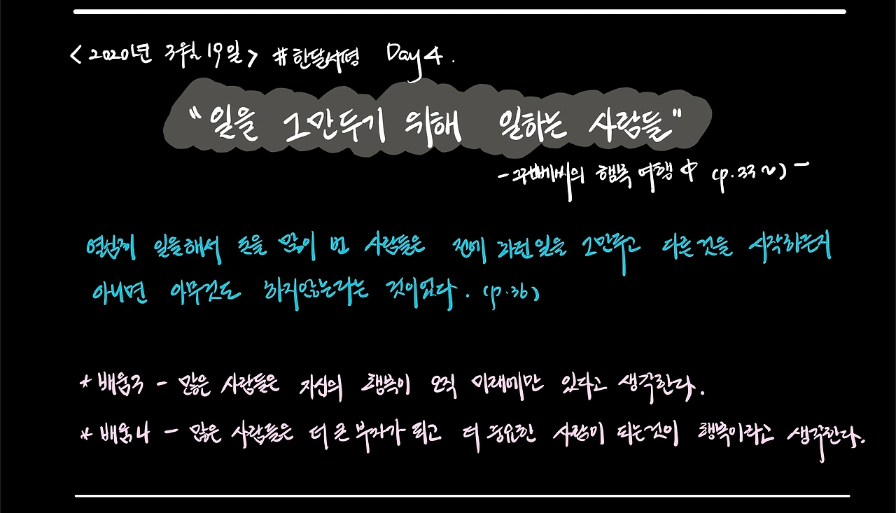 내가 이 챕터 “일을 그만두기 위해 일하는 사람들”이라는 구절을 목차에서 읽었을 때, 회사 후배 녀석이 생각났다. 녀석은 욕심도 있고, 능력도 있는데 좀처럼 회사일에 흥미를 붙이지 못하는 것 같았다. 술자리에서 이런저런 얘기를 들어보면 젊어서 돈 많이 벌어서 하루라도 빨리 경제적 자유를 얻겠다고 말했다. 그러면서 지금은 인내하는 중이라고 했다. 난 그에게 지금이 즐겁지 않은데, 미래가 즐거울 수 있을까?라고 되물었는데 명확한 대답을 듣지 못했던 것인지 내 기억에는 남아있지는 않다. 아직도 후배 녀석은 자신의 신념을 믿고 있는 것 같다.