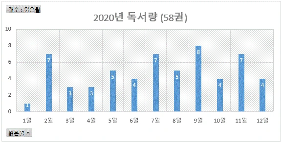 월별로 정리를 해보니 3~4월이 빈약한데, 제 두 번째 책 <독서의 맛> 마지막 작업을 하느라 정신이 없었던 기간이라서 그랬던 것 같습니다. 1월은 31일 자부터 기록했습니다. (안식기간 후부터) 여름이 다가오면서 책의 양을 늘렸고, 두꺼운 책(벽돌 책)을 선택하면서 권수를 늘리지는 못했지만 지식을 쌓을 수 있는 효율적인 독서를 했습니다.