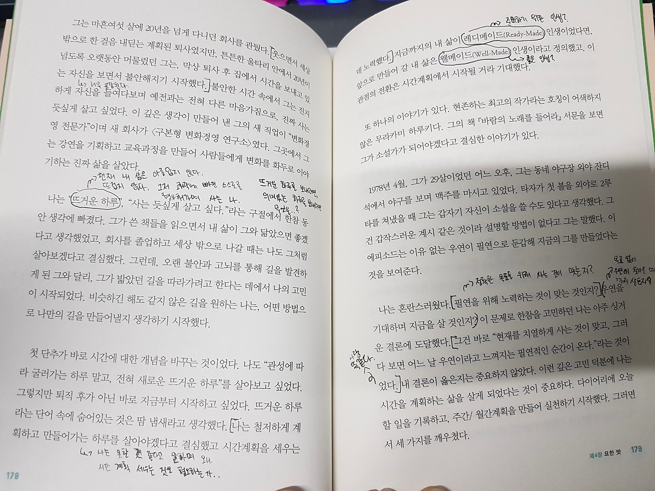 나의 자기 계발도 이런 일반적인 흐름과 별반 다르지 않았다. 오랜 기간 독서량을 늘리기에 힘썼고, 독서만으로 채워지지 않던 (읽은 것들이 머릿속에서 계속 흩어지고 사라져 버린다는 생각) 불안감이 “쓰기”라는 시도를 해보게 만들었다. 그렇게 쓰다 보니 ‘다른 사람들은 책도 쓰는데 나라고 못써볼게 뭐 있을까?’와 ‘내 주제에 책을 쓴다는 게 말이 되나?’ 사이에서 수년간 갈등했다. 그리고 “일단 저질러보자.”라는 생각으로 썼던 A4 120페이지가 한 권의 책이 되었다.