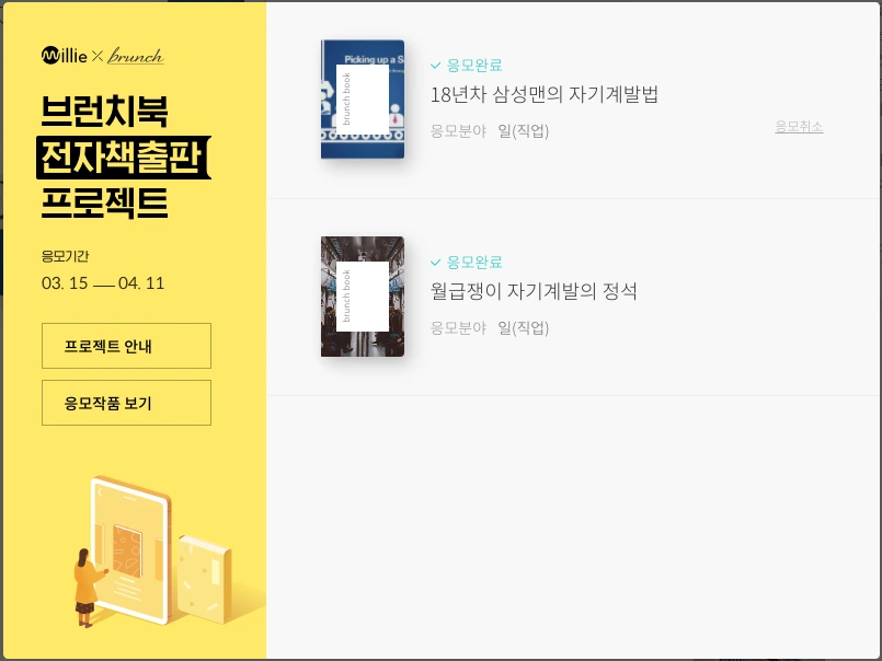 지난 일요일(2021.04.11) 브런치에서 진행하는 <밀리의 서재 & 브런치 출판 프로젝트>의 마감일이었다. 올해 내 글쓰기 목표가 브런치북 2권 출간이라서 이 프로젝트를 봤을 때 ‘아하! 이거다.” 싶었다. 그래서 내가 참가하고 있는 자기계발 커뮤니티에서 진행하는 글쓰기 과정에서 브런치북을 출간하는 글을 쓰기로 마음먹고 지난 2월 1일부터 한편씩 글을 쓰기 시작했다.