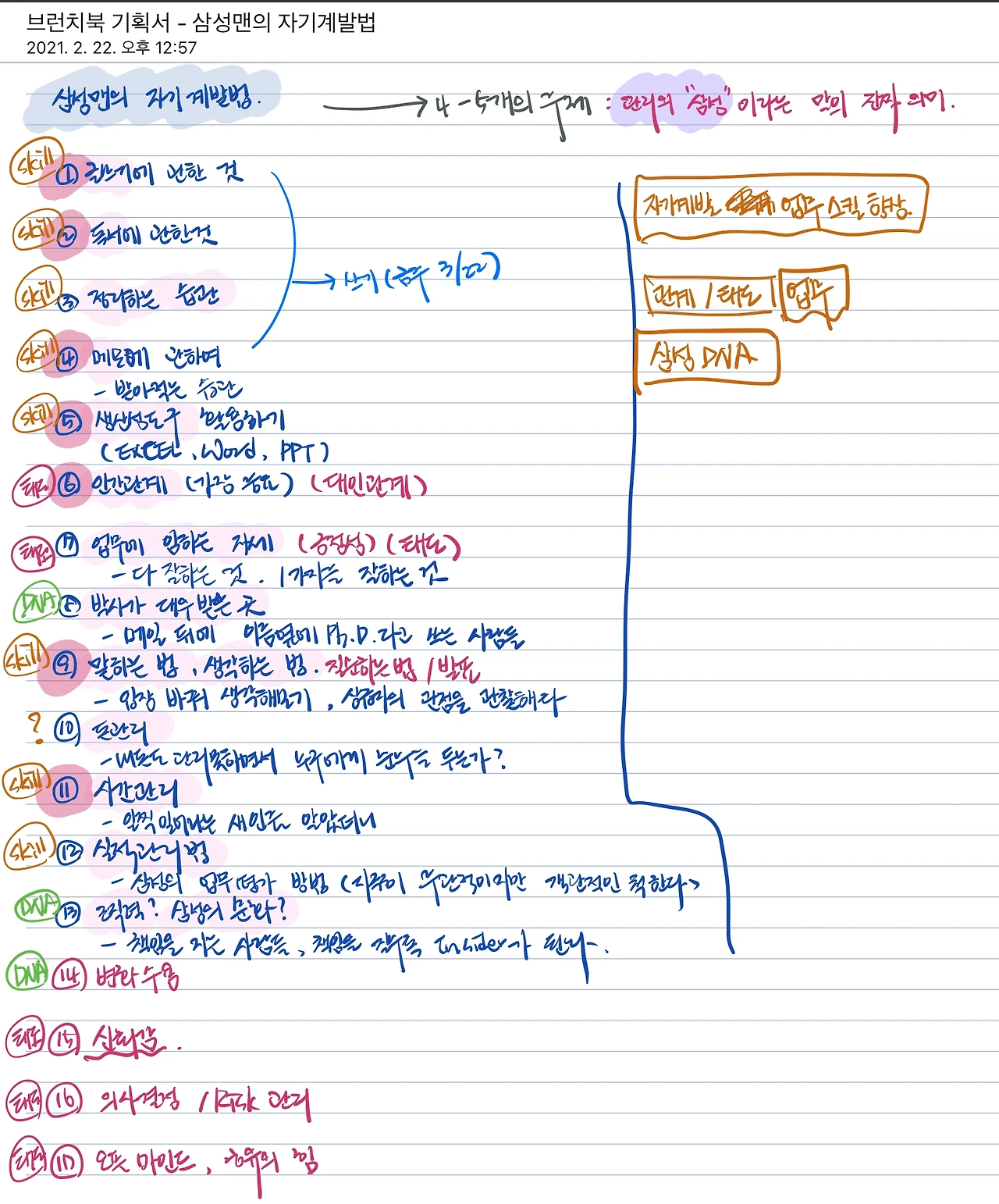 가제 <삼성맨의 자기계발법>으로 총 15~20부 분량을 글을 예상했고 목차를 만들어 한 꼭지씩 글을 채워나갔다. 약 70일의 기간 동안 위 제목으로 16편의 글을 썼고, 3번의 퇴고 과정을 거쳤다. 그렇게 내 인생 두 번째 브런치북 <18년차 삼성맨의 자기계발법>이 지난주 토요일(2021.4.10)에 발행되었다.