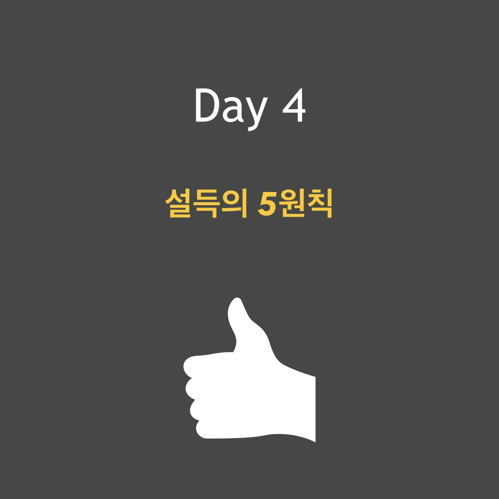 최근 읽었던 샘 혼의 <오늘부터 딱 1년, 이기적으로 살기로 했다>에서 가장 내 눈길을 끌었던 문구가 바로 <YES를 끌어내는 설득의 5원칙>이었다. 분명 다른 자기 계발서에서도 이와 비슷한 내용을 문구를 봐왔었는데 이 책에서 이 문구에 꽂힌 것은 아마도 요즘 내 처지가 타인을 설득해야 하기 때문인 것 같다. 샘 혼이 제시하는 설득의 5원칙을 노트에 꾹 눌러 적으면서 각각의 경우를 곰곰이 생각해보았다.