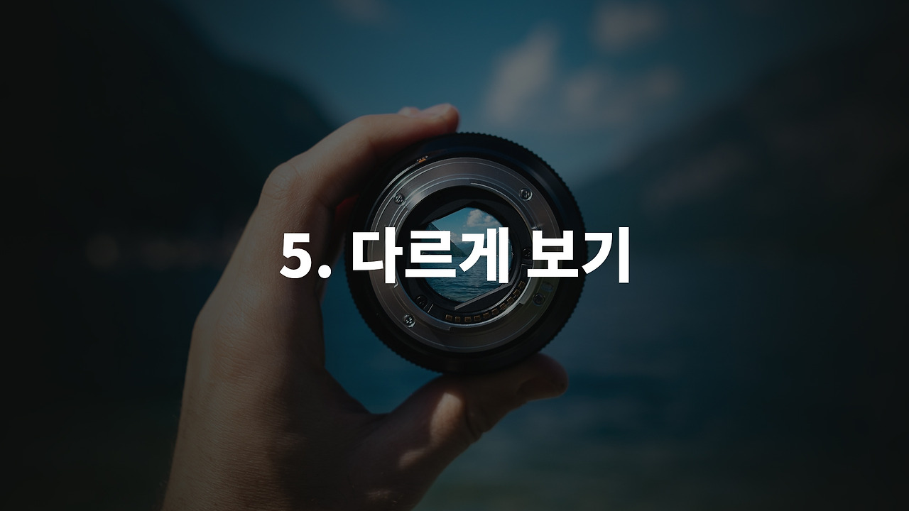 오늘 말씀드릴 성공하는 직장인의 자기 계발 습관 중 첫 번째 태도 편 그 마지막 다섯 번째는 “다르게 보려는 태도”입니다. 이건 쉽게 되는 건 아니고 지속적인 노력이 필요합니다. 사물과 사건(일)을 깊게 관찰하는 태도를 가져야 합니다. 똑같은 풀을 봐도 누구는 풀로 보고 누구는 민들레라는 이름으로 느낍니다. 또 누구는 민들레를 넘어 민들레의 홀씨가 날아가는 모습을 상상할 것이고, 또 누구는 민들레의 약효에 대해 떠올릴 수도 있을 겁니다. 이렇듯 같은 것을 보고 전혀 다른 생각을 할 수 있는 것은 인간만이 가지고 있는 생각의 힘이죠. 우리는 생각의 힘을 키워야 합니다. 그래야 똑같은 현상을 볼 때도 좀 더 새로운 시각으로 다양한 관점에서 볼 수 있습니다. 결국 세상이 요구하는 창의력은 지금까지 여러분이 만들어놓은 생각의 체계 안에서 만들어집니다. 그래서 여러분들은 그 생각의 틀을 깊고 넓게 만드는 노력을 해야 합니다. 어떻게? 많이 보고 많이 읽고 많이 해보고 많이 듣고 많이 써보는 것입니다. 독서와 글쓰기, 사람 사귀기, 여러 다양한 콘텐츠를 많이 접하는 것. 이런 일상적인 것들을 그냥 흘리지 마시고 사소하고 단편적이더라도 의미를 부여해서 여러분의 그릇에 담는 노력을 꼭 해보세요. 본 것을 생각으로 느끼고 그걸 글로 담아내고 말로 뱉는 과정에서 여러분은 좋은 눈(관점)을 갖게 될 것입니다.