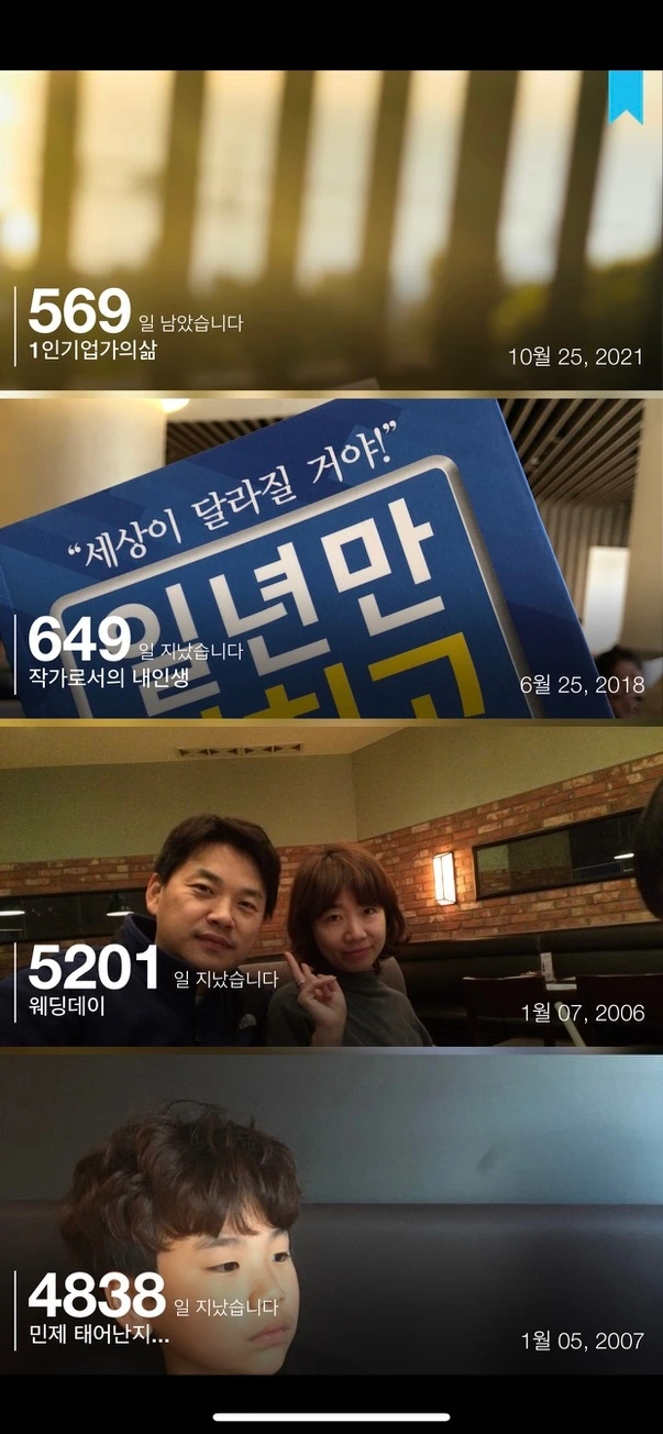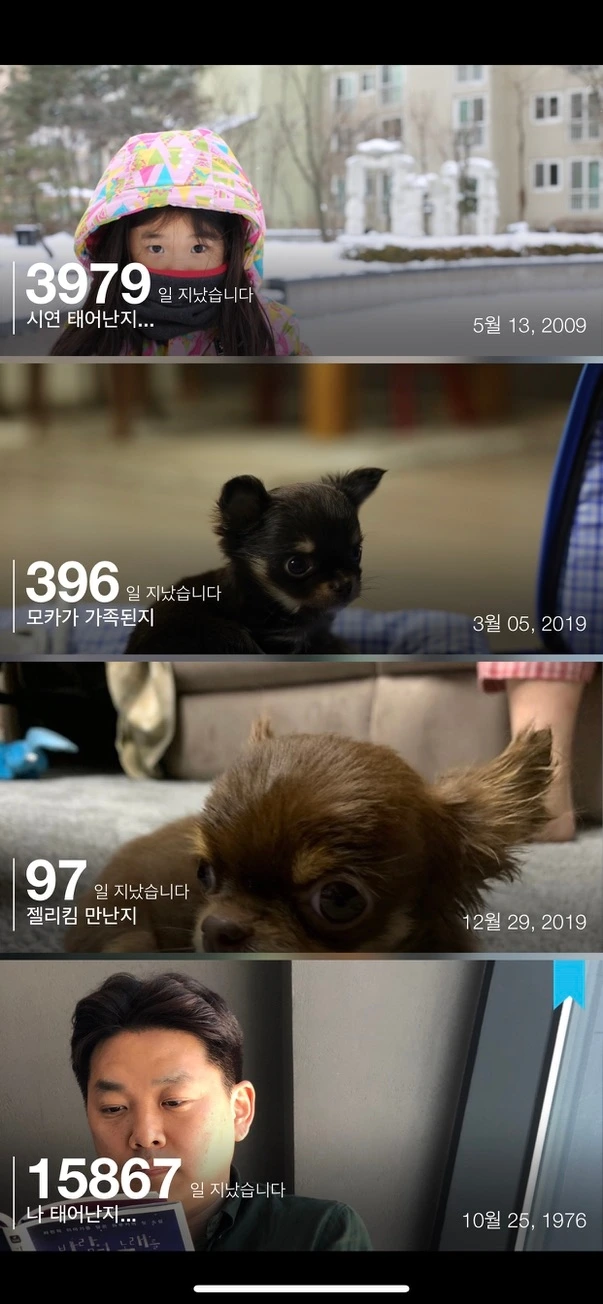 아이폰3gs 시절 첫 유료 어플로 샀던 BIG Day라는 어플인데 위 사진처럼 기록하고 싶은 날짜를 넣어 가끔 숫자를 보면서 지나온 시간을 복기하곤 한다. 숫자를 보고 있으면 #하루 라는 날짜가 내 삶의 추억 같은 순간으로부터 얼마나 멀어지고 있는지 느껴진다.