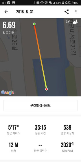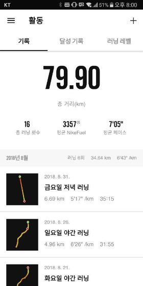 6월 27일부터 시작해 대략 60일 동안 지속한 러닝은 그동안 총 16회, 약 80키로를 뛰었고 km당 7분을 기록했다. 처음 시작했던 1회에는 2.59키로조차 뛰기가 힘들었고 키로당 7분 42초를 기록했었다. 하지만 8월 마지막 날 러닝은 6.69키로를 키로당 5분 17초에 주파할 수 있었고, 나이키 앱에서 묻듯이 옆사람과 대화할 수 있을 정도의 페이스를 유지했다.
