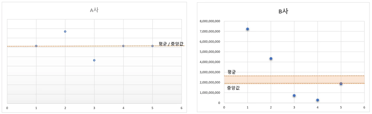 평균과 중앙값을 붙여놓으면 이렇게 차이가 나는 것을 알 수 있다. B사의 경우 연 매출의 평균과 중앙값의 차이가 대략 10억이나 난다. 이런 평균을 보고 B사의 신장이나 건전성만을 판단하기엔 무리가 있다. 중앙값은 평균으로부터 이탈한 값들을 확인할 수 있으므로 평균과 함께 확인해보는 것이 바람직하다.