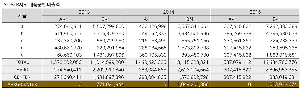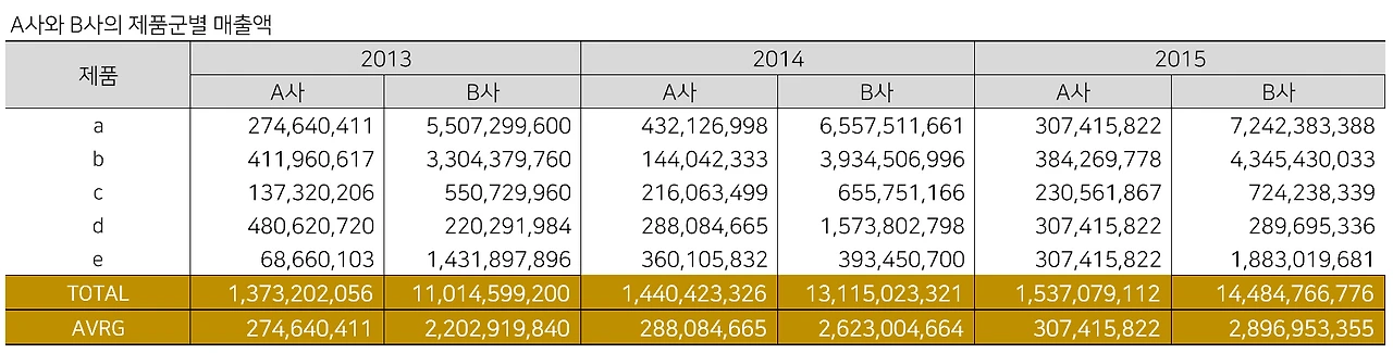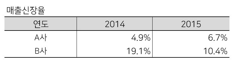 표를 보면, A사와 B사는 2013년부터 3년 동안 큰 폭으로 성장했다. 2013년~2015년 물가 상승률(1.7~0.7%)을 감안하더라도 성장한 것임이 분명하다. 또한 A, B사 모두 연평균 매출도 안정적으로 이어나가고 있다. 자 과연 그럴까?