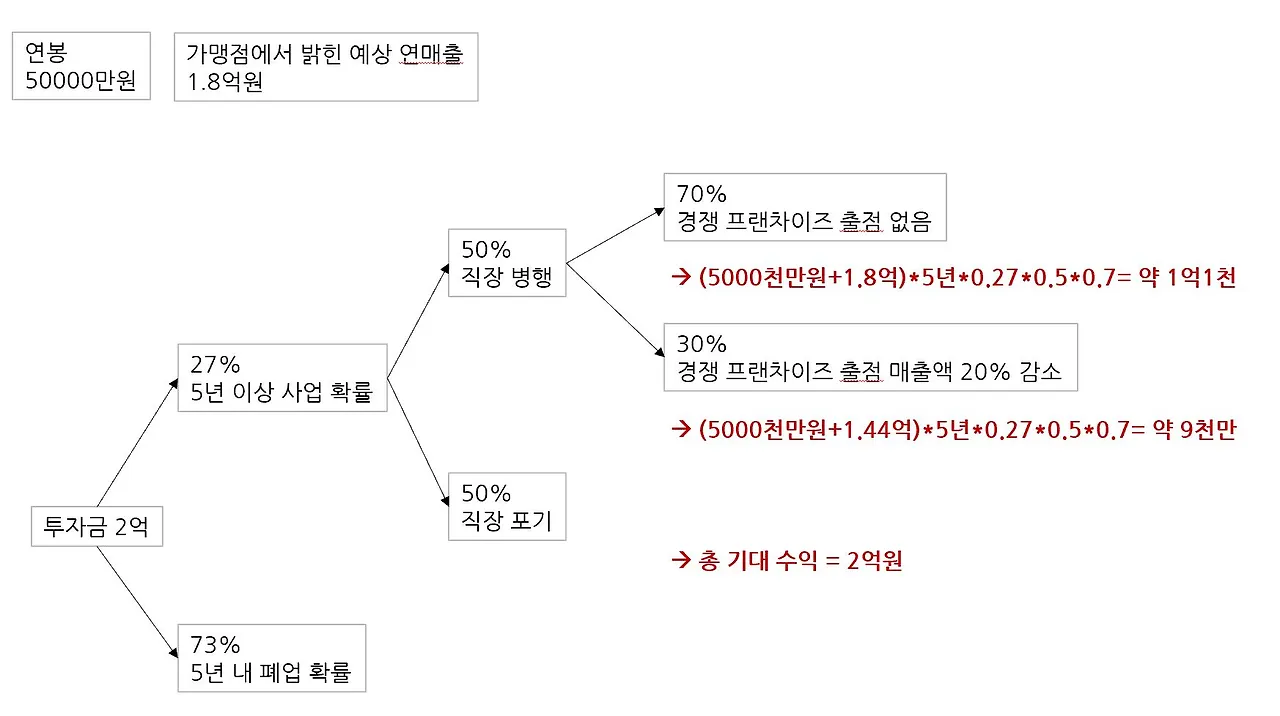 위의 표에서 볼 수 있듯이 (계산이나 과정에 오차가 있을 수 있다) 가맹 계약을 위해 2억을 투자해서 5년 동안 벌수 있는 기대수익이란 2억이다. 직장을 포기하고 버는 돈은 아예 계산에 넣지 않았고, 5년 내 폐업하여 잔존가치를 처분하고 남길 수 있는 돈 역시 계산에 넣지 않았다. 이 모든 걸 계산에 넣는다고 하더라도 어떤가 투자할만한 가치가 있다고 평가할 수 있는가? 2억을 투자하고 밤낮없이 5년 동안 투잡을 뛴 기대수익이 2억 원이라면.