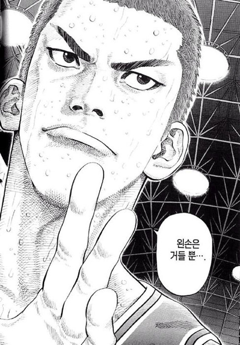 제가 강백호를 정말 동경하게 된 이유는 바로 이 때문입니다. 누구에게도 주눅 들지 않는 그의 당당함과 베짱이 소심한 성격에 미안하다 고맙다를 입에 달고 사는 저의 비굴함과 달라서 그랬습니다. 저 같은 사람은 시합 전 상대 골대에 덩크를 꽂기 위해 프리스로에서 뛴다든지, 평소 같지 않게 주눅 든 채치수에게 똥침을 날린다든지, "산양은 이 천재가 쓰러뜨린다"라며 운영진 테이블 위에 올라가는 행동은 상상도 못할 일이었니까요. 돈 한 푼 없는 주제에 에어조던 신발을 사는 천연덕스러움은 또 어떤가요. 백호가 어딜 가나 함께하고, 백호가 진짜 바스켓맨으로 성장하기를 진심으로 바라고 도왔던 양호열 이하 기타 등등 '강백호 군단'만 보아도 강백호의 인간다운 매력은 굳이 설명하지 않아도 알 수 있습니다.