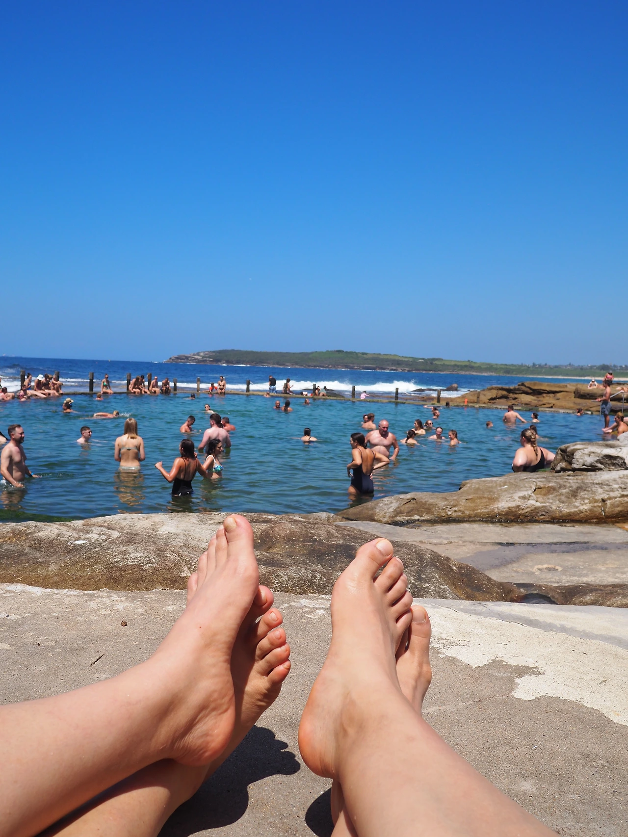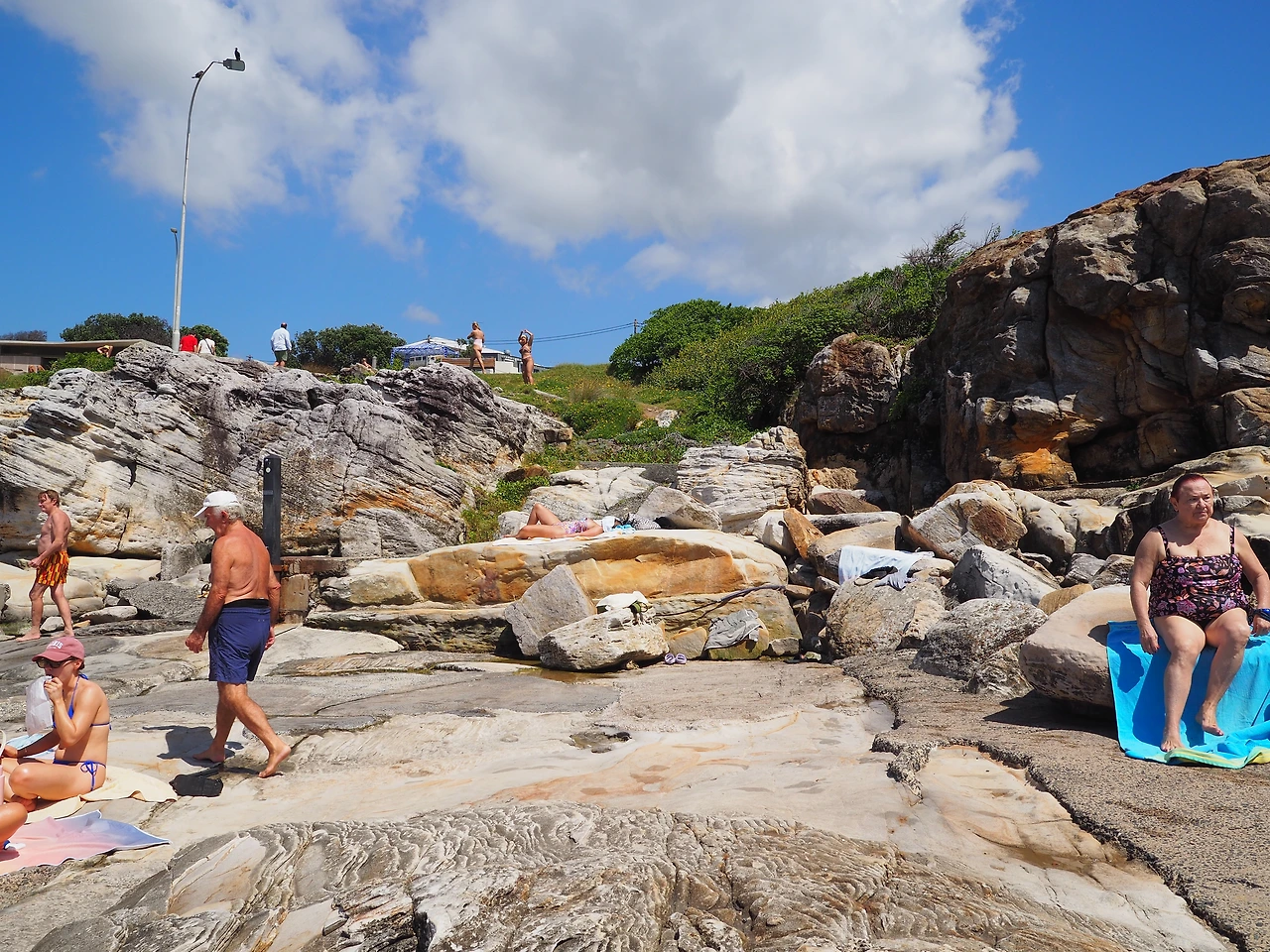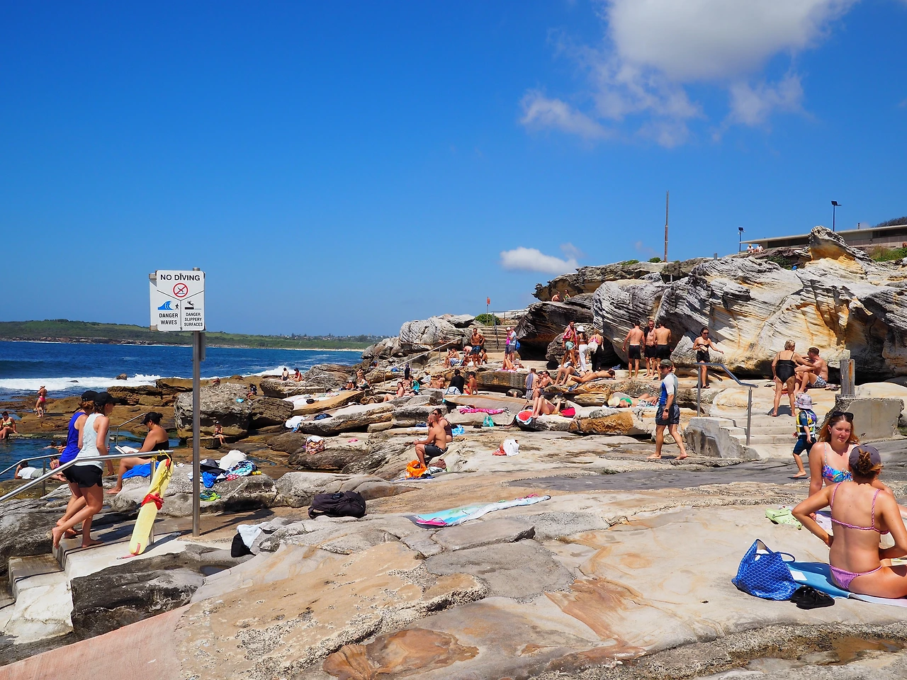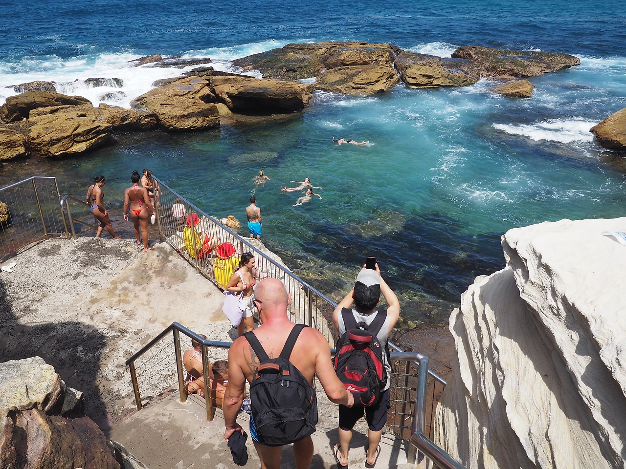 마혼 풀은 마러브라 비치(Maroubra Beach) 바로 위에 있다. 멀리서 보기에도 파도가 제법 높아 서퍼들이 바다를 빼곡하게 채우고 있었다. 포르투갈에서 서핑을 하다가 종아리에 쥐가 심하게 나서 몇 주를 고생한 경험이 있어 서핑에 대해서는 생각이 없었지만, 그걸 즐기는 사람들을 보는 것도 큰 즐거움이다. 해변을 따라 걸어가다보니 저쪽에 건물 하나가 보인다. 마혼 풀로 들어가는 입구이자 샤워실, 화장실 역할을 하는 곳이다. 거기서 수영복으로 갈아입고 계단을 따라 내려가니 기암절벽 사이에 있는 수영장이 하나 보인다.