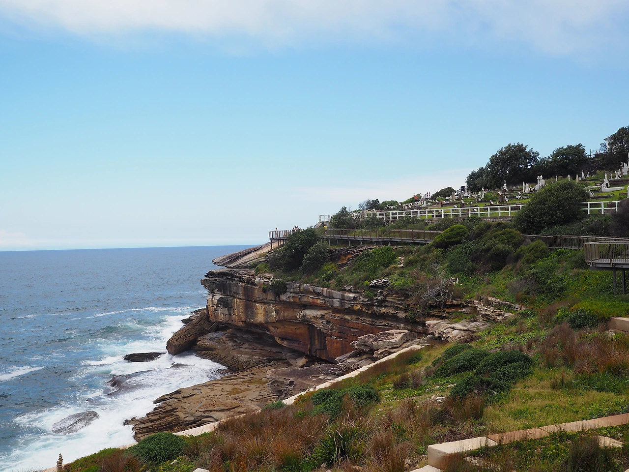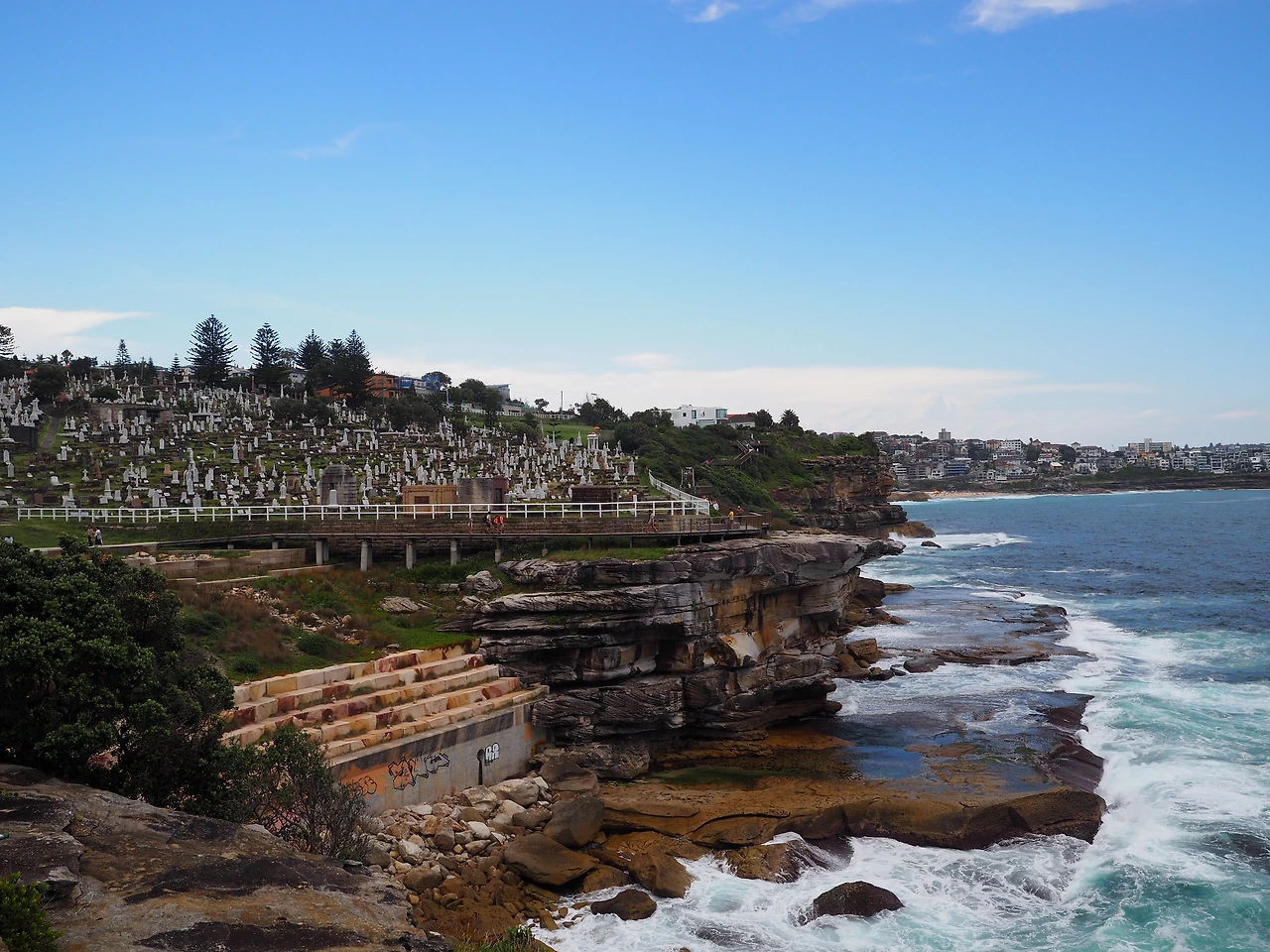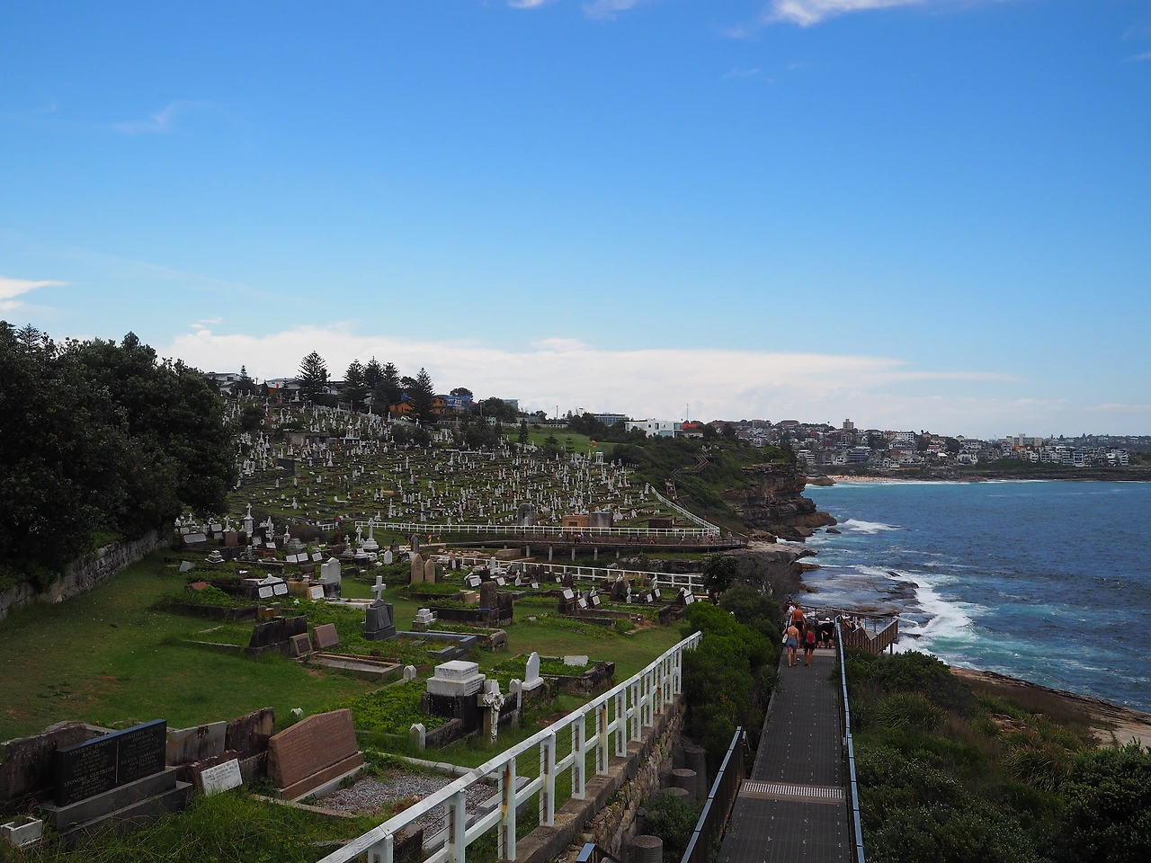 수영장에서 도시락을 꺼내먹고 나니 어쩐지 수영은 다 한 기분이 들었다. 얼렁뚱땅 샤워를 마치고 나왔다. 해변에는 어차피 수영복만 입고 다니는 사람 천지다. 수영복 위에 반바지와 얇은 바람막이 하나만 입고 트래킹 코스로 향했다. 트래킹 코스도 마찬가지로 구글 지도에서 찾은 기가 막힌 곳이었다. 본다이 해변과 쿠지 해변을 잇는 코스(Bondi to Coogee Walk)인데, 그 사이에 있는 공동묘지(Waverly Cemetery)가 장관이다.