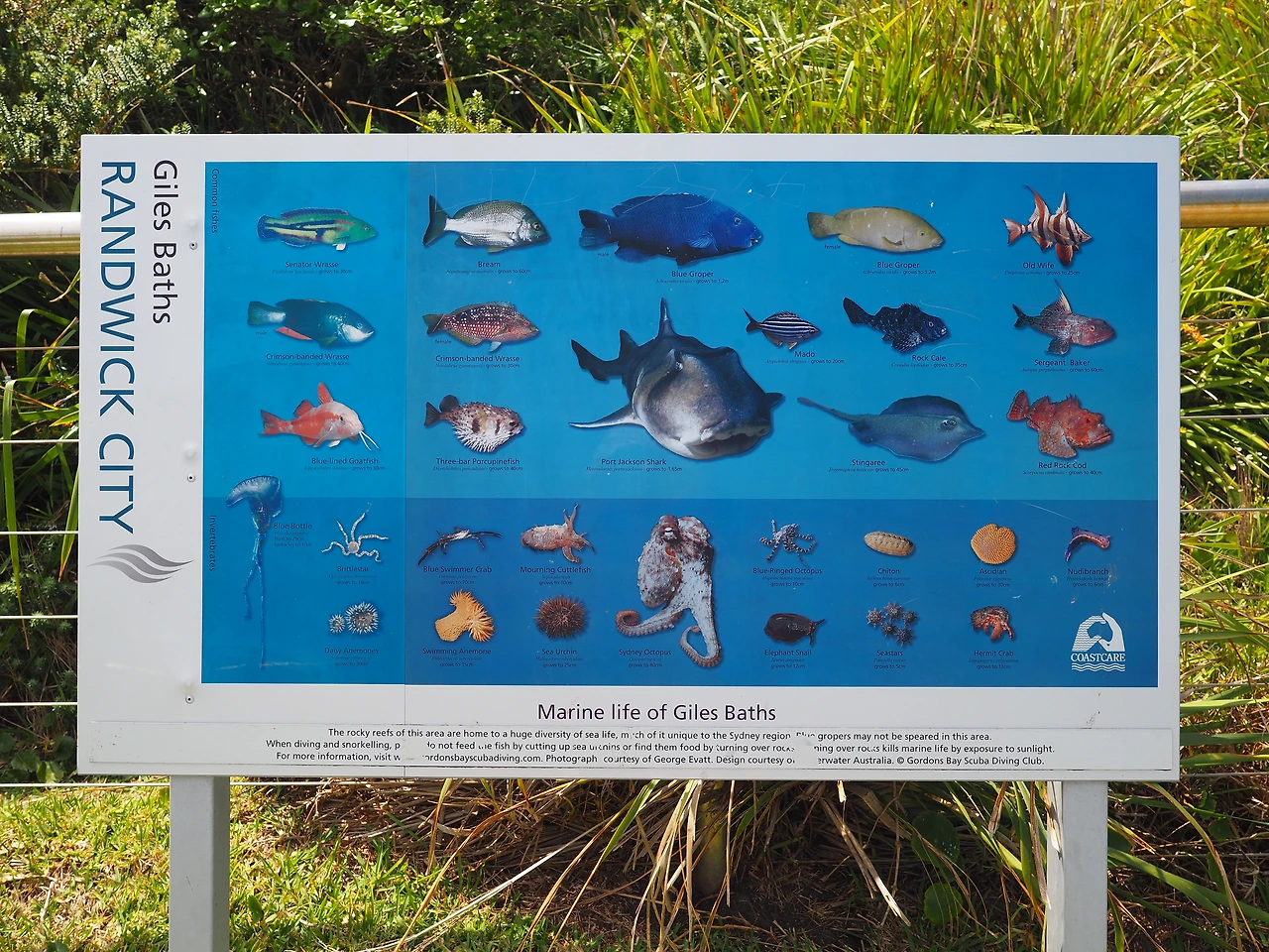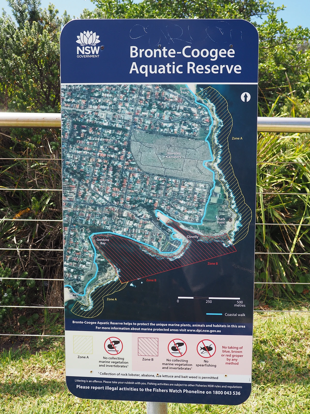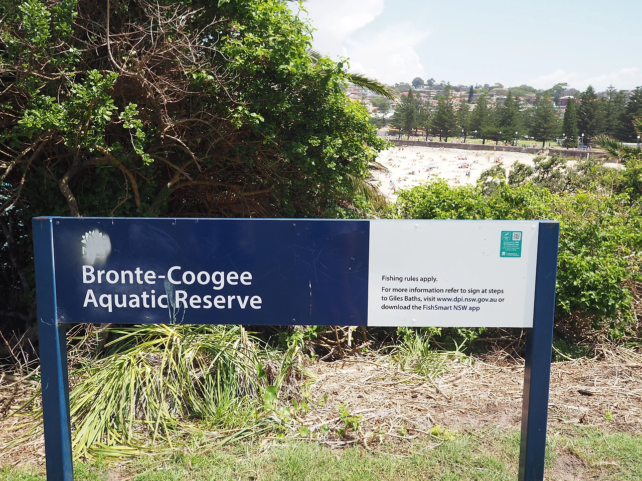 멀지는 않지만 체력을 아끼기 위해 버스를 타고 마혼 풀에서 트래킹 코스의 시작인 쿠지 해변까지 가기로 했다. 주말의 소비 생활을 촉진하기 위해서인지 시드니는 주말 교통비가 평일보다 저렴하다고 한다. 정확한 시스템은 아직도 이해하지 못했다. 아무튼 할인가로 버스 한 번에 한화로 대략 2000원 가량을 지불했다. 쿠지 해변에도 서퍼들이 가득이다. 수영을 하고 났더니 밥을 먹었는데도 허기가 져서 카페에서 설탕이 잔뜩 묻은 시나몬 롤 하나를 사서 가면서 한 입씩 먹었다. 역시 꿀맛이다. 트래킹 코스를 찾아 걸어가려는데 표지판 하나가 눈에 띈다. ‘브론테-쿠지 아쿠아틱 리저브(Bronte-Coogee Aquatic Reserve)’라고 써있다. 바로 옆에는 그 지역에 서식하는 물고기와 해양생물에 대한 표지판이 있다. 우리나라로는 해양보호구역의 개념에 해당하지 않을까 싶다. 자연보호를 위해 애쓰는 사람들이 있어 호주의 자연환경이 그렇게 아름다울 수 있다는 생각이 들었다.