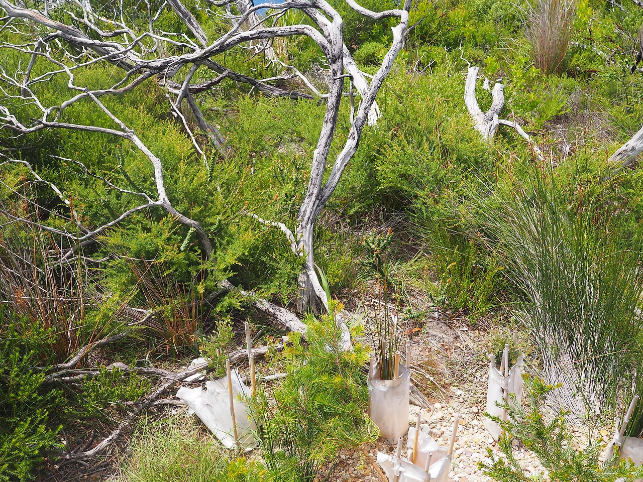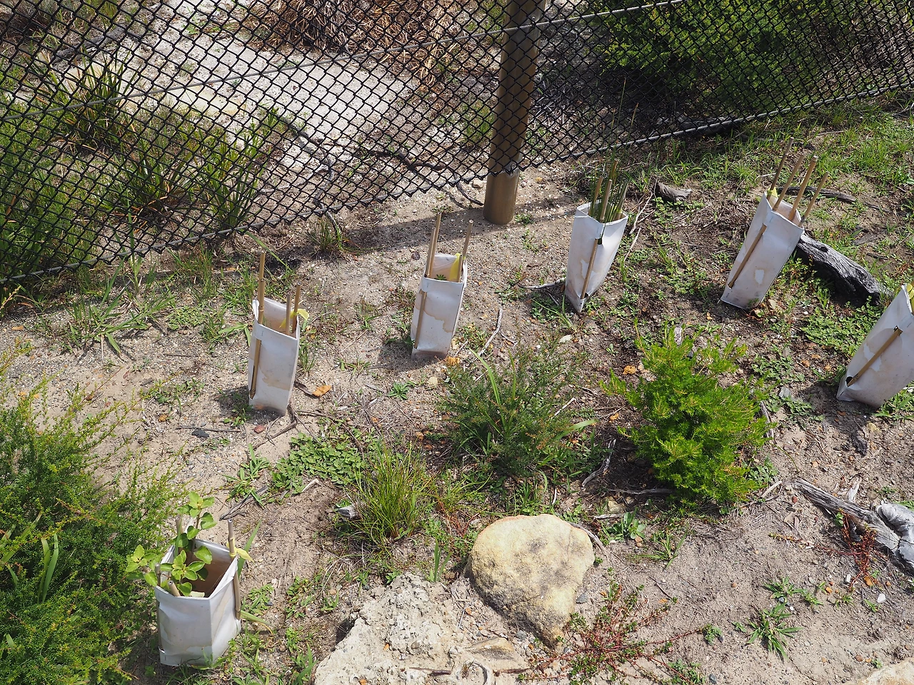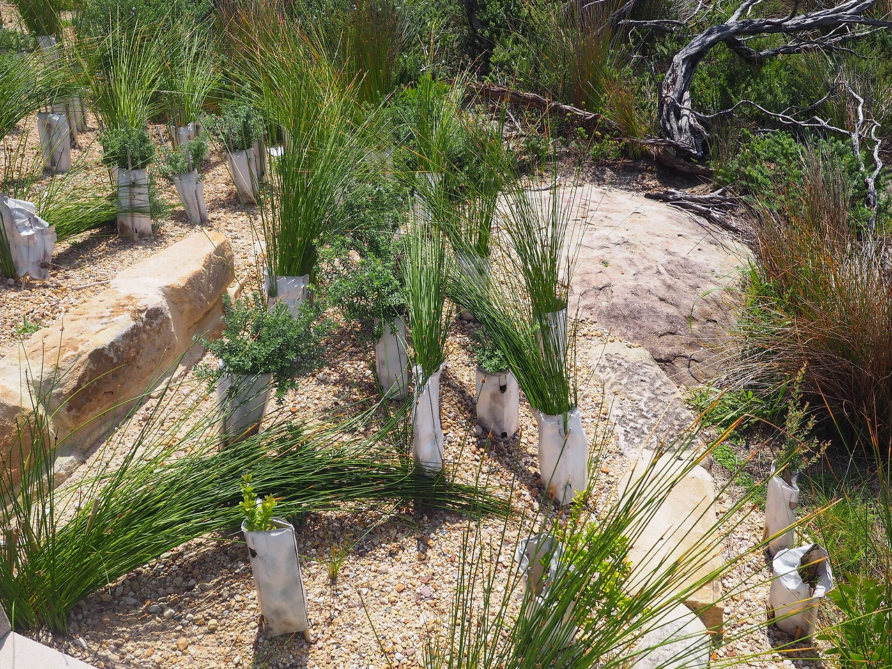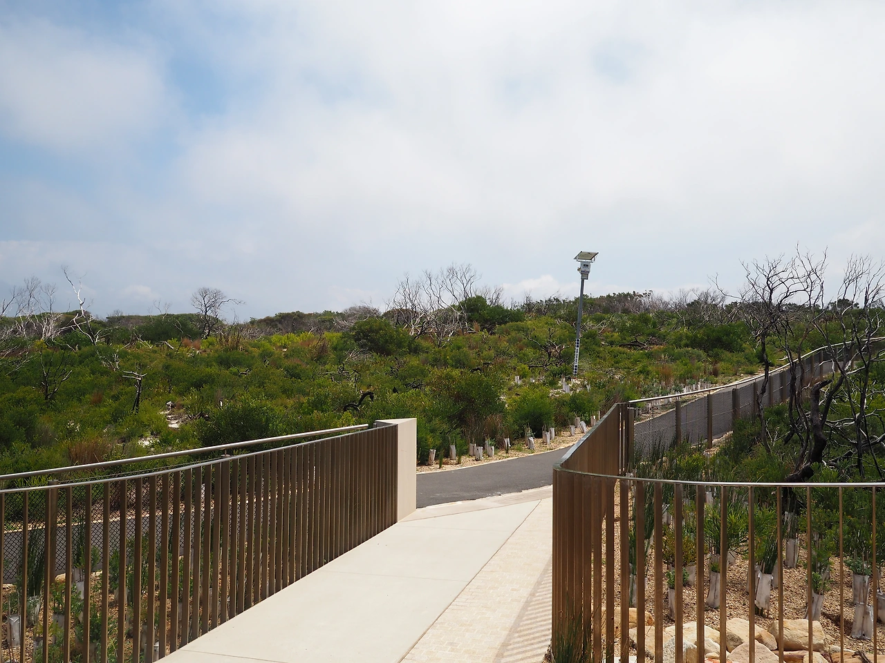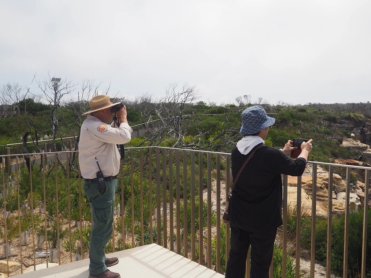 걷다 보니 군데군데 우유곽 만한 종이 틀 네 귀퉁이를 대나무로 보강하고 새로 나무나 풀을 심어놓은 것도 많다. 이 풍경의 정체가 궁금해질 무렵, 동쪽 전망대에서 귀인을 만났다. 이 지역은 시드니 하버 국립공원에 속하는데, 국립공원 관리인 중에서도 수다쟁이를 만난 것이다. 우리가 먼저 인사를 건네고 어째서 나무들이 검은지 묻자, 2019년에 있었던 화재로 나무들이 다 타버려서 지금과 같은 풍경이 되었다고 한다. 이 지역은 원래 군사지역이었으나 1990년대에 철수한 곳이다. 군사지역일 때에는 황무지였는데 군인들이 이 땅을 떠나자 바람을 타고 온 식물 씨앗들이 잎을 틔워 자연스레 수풀이 조성되었다. 무성해진 수풀은 화재로 타버렸으나 나무가 타면서 씨앗을 뿌리면서 자연스럽게 다시 풀과 나무가 자라기 시작했다. 거기에 더해서 인간이 우유곽 사이즈 종이 안에 씨앗을 심어 거친 자연환경에서 잘 자리잡을 수 있도록 도와준 것이다. 호주에서는 많이 쓰이는 식재 방식이라고 했다. 종이도 대나무도 생분해가 되니 좋지만, 뿌리를 내린 식물이 조금 더 자라고 나면 종이곽을 철거할 예정이라고 한다. 화재 이후 5년 만에 지금의 모습이 되었다니 놀라울 따름이었다. 산책로와 전망대 또한 작년 5월 즈음 공사가 완료되어 대중에게 공개된 것이라 한다.