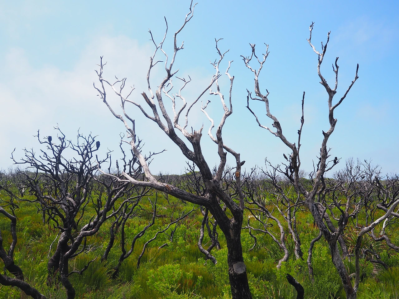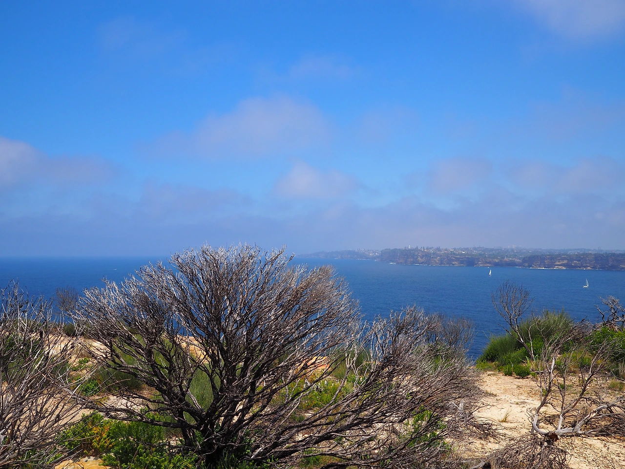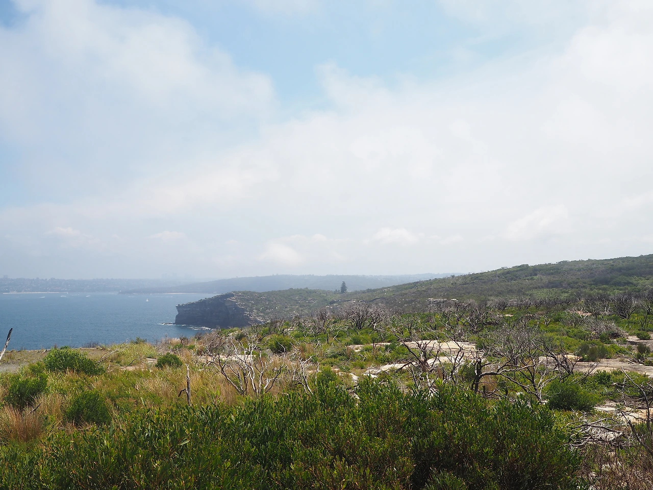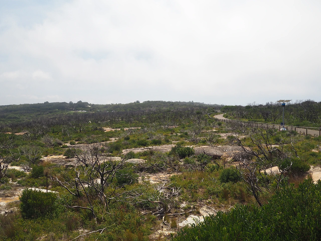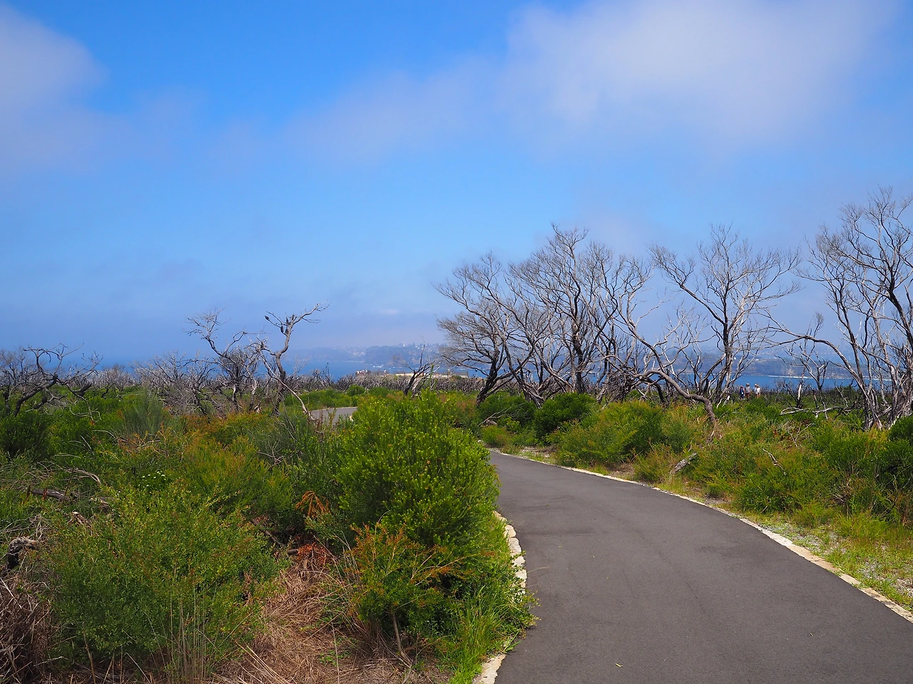 버스에서 내리니 생경한 풍경이 펼쳐진다. 검은 나무가 사방에 삐죽삐죽 솟아 있고 아래로 새로 난 나무 덤불이 무성하다. 노스 헤드를 둘러싼 페어팍스 트랙(Fairfax Track)을 돌기로 했다. 30분에서 1시간 정도 걸리는 1km짜리 코스다. 동쪽과 서쪽에 각각 전망대(Yiningma Lookout, Burragula Lookout)도 있다. 우리는 시계 반대 방향으로 걸어 서쪽 전망대를 먼저 보고 동쪽 전망대로 갔다. 서쪽 전망대에서는 시드니 시내가, 동쪽 전망대에서는 층암 절벽 구조를 볼 수 있다. 그야말로 절경이다. 산책 코스도 전망대도 모두 멋지게 디자인되어 있다.