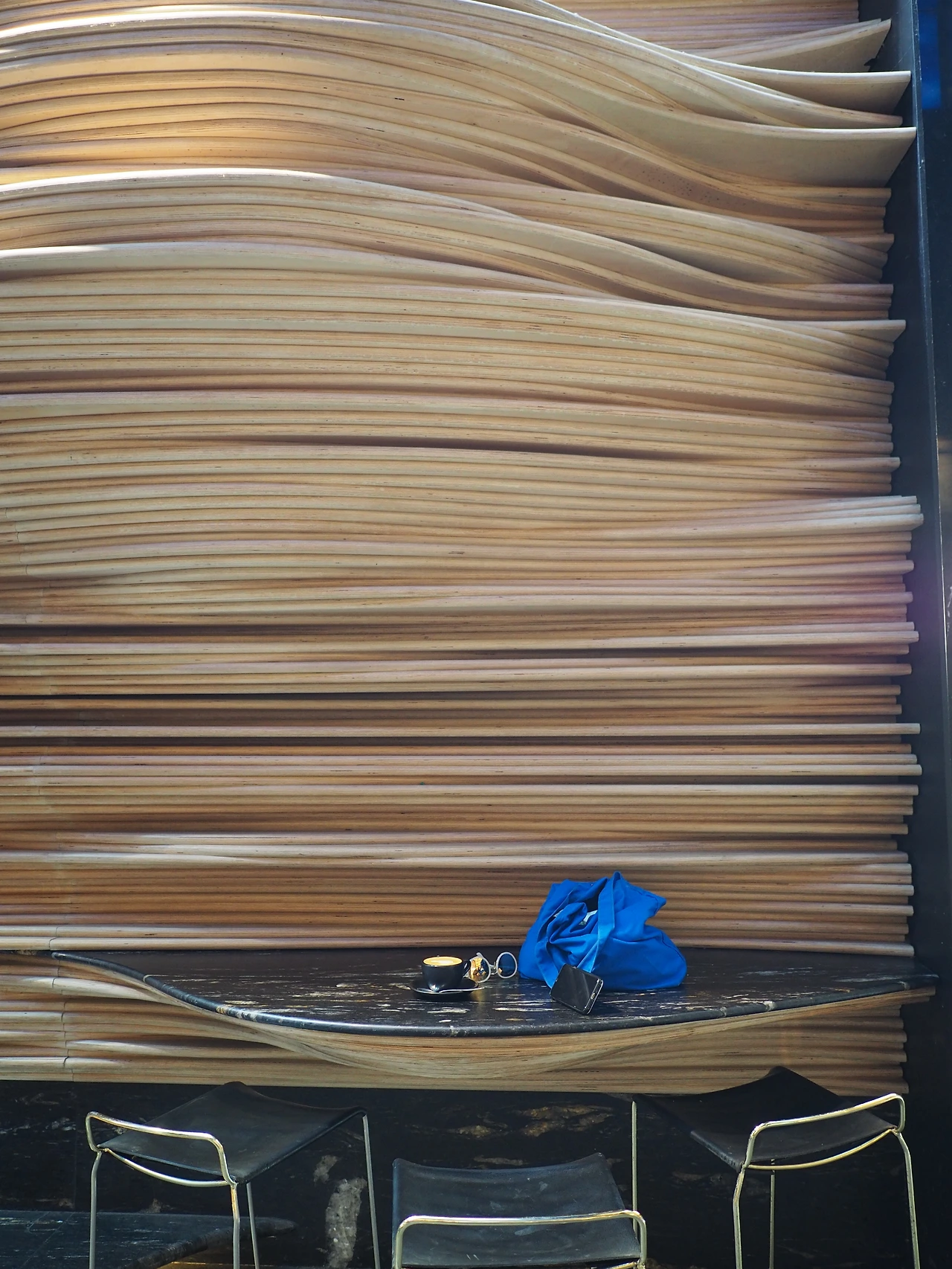 카페는 백화점 1층에서 밖으로 나가는 통로에 위치해 있었는데, 벽면에 목재로 멋진 곡선을 장식해놓았다. 디카페인 플랫화이트 한 잔을 시켰는데, 주말이라서 한 번, 매장에서 마신다고 또 한 번 값이 붙었다. 그래도 한화로 약 5500원 정도니 서울 커피값을 생각하면 나쁘지 않은 가격이다. 아이스로 주문하는 걸 깜박했더니 카푸치노 같은 커피가 나왔다. 우유 커품이 크리미한 게 아주 별미다. 커피 맛도 좋다. 내내 앉아서 커피 한 모금 한 모금을 소중히 마셨다. 한 시간의 꿀같은 시간이었다.