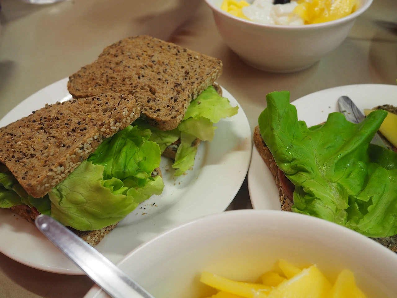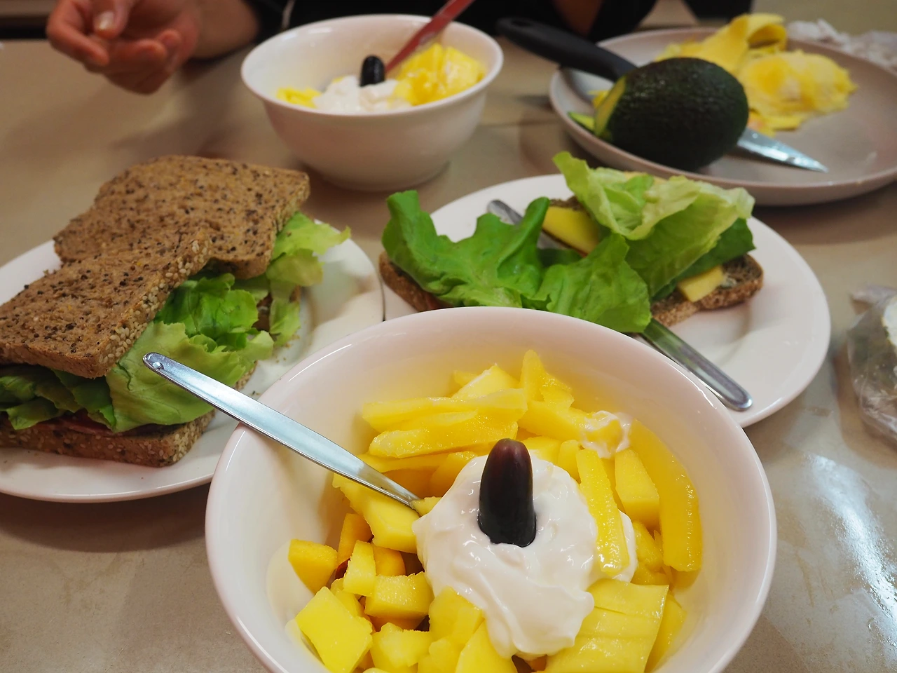 아침은 또 요거트와 오픈 샌드위치. 아침을 든든하게 먹고 나가야 하루가 힘차다는 것이 우리 집의 가훈 아닌 가훈이다. 오늘의 요거트용 과일은 천도복숭아와 망고, 샌드위치 재료는 새로 산 살라미와 차이브가 들어간 치즈, 상추, 천도복숭아와 망고다. 도시락은 같은 샌드위치에 뚜껑만 덮었다. 어제 산 포도가 아주 달고 맛있어서, 자두와 함께 간식으로 챙겼다. 도시락은 내가 들고 가기로 하고 끝까지 같이 가자며 입을 삐쭉거리는 엄마를 내보냈다. 좀 더 누워서 빈둥거리며 놀까 했는데 생각보다 카페를 즐길 시간이 짧을 것 같아 얼른 숙소를 나섰다.