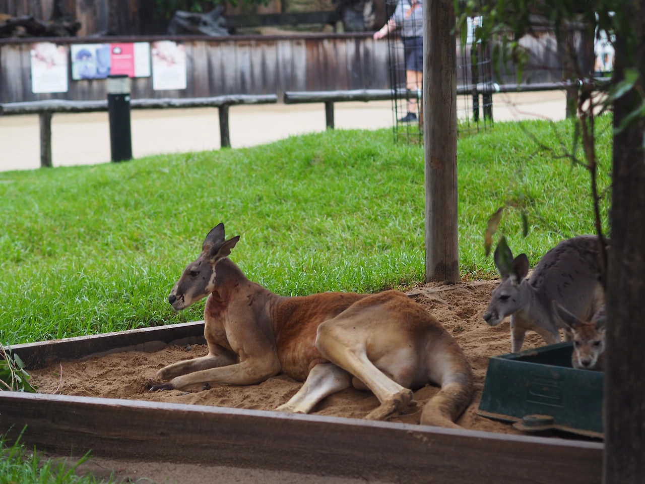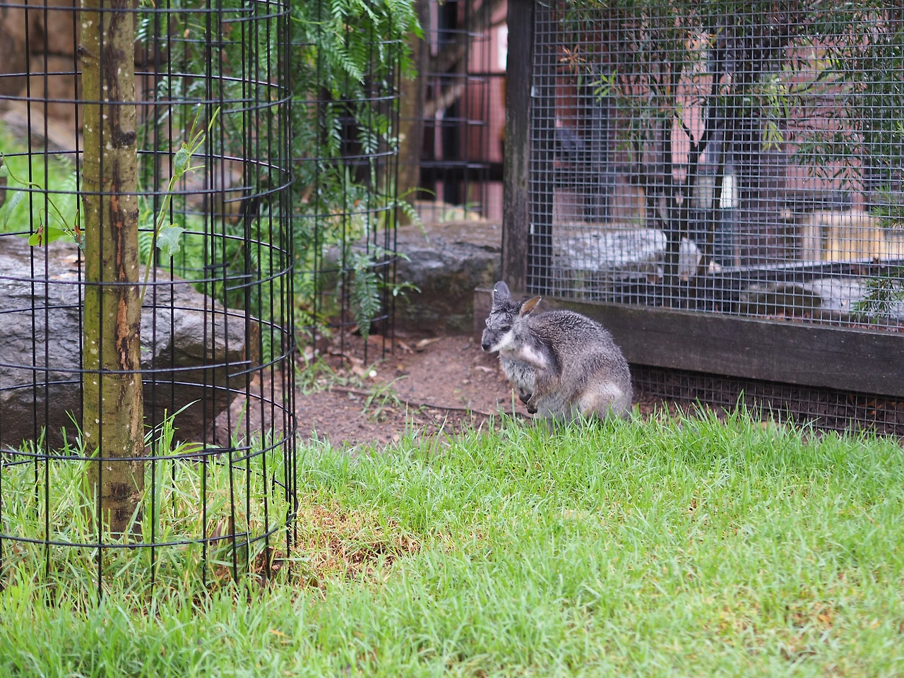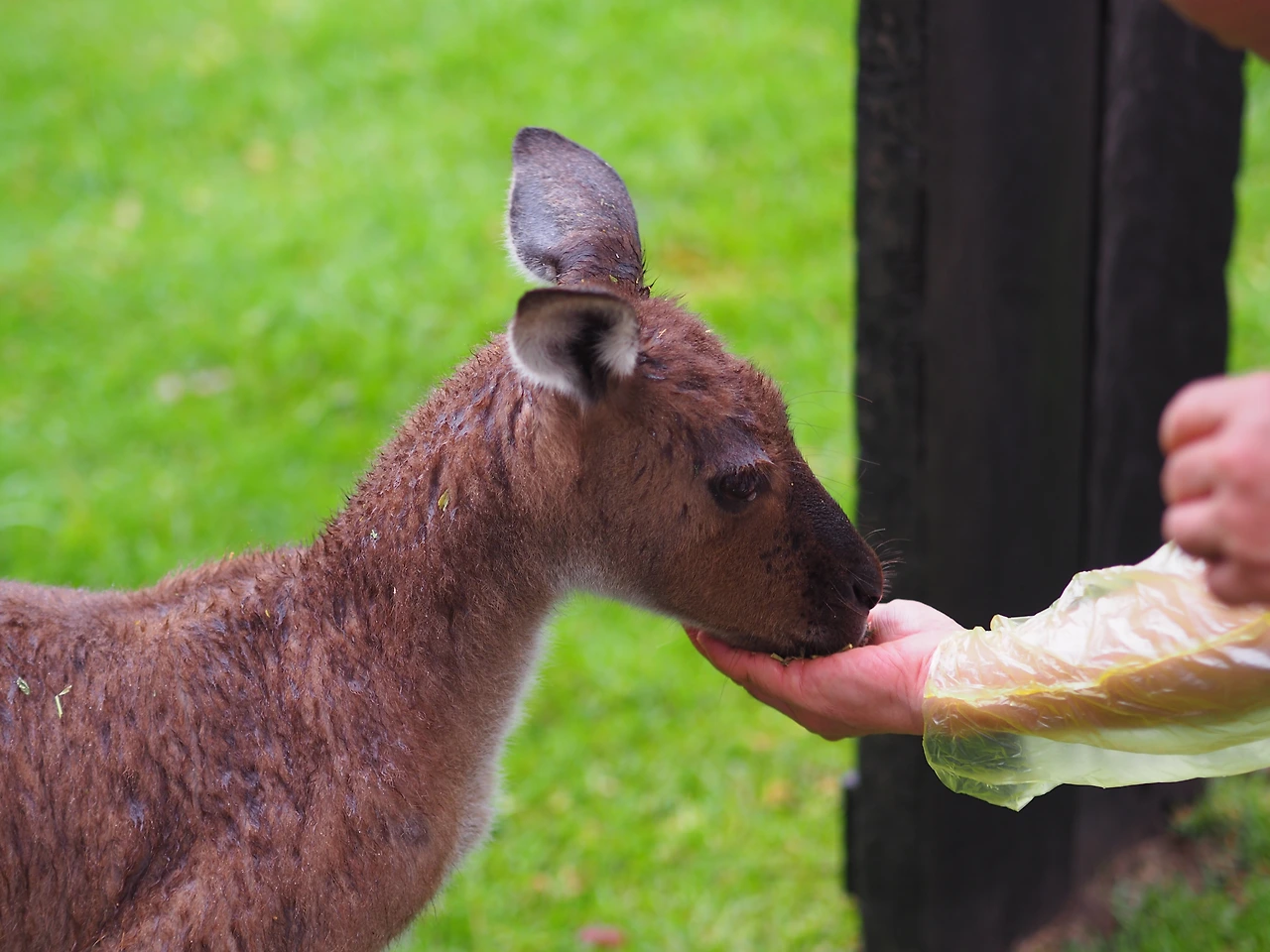 생츄어리 스타일의 동물원이라 들었던 것 같다. 입장하면서 소주잔 정도 크기의 종이컵에 캥거루 먹이를 받았다. 점점이 오던 비는 점점 굵어지기 시작했다. 무게를 맞춘다고 각각 우산과 우비를 두고 왔는데, 이렇게 비가 거세게 올 줄은 몰랐다. 다행히 비가 와도 캥거루들은 밖에 돌아다니고 있었다. 커다란 녀석들은 배부르고 귀찮은 표정으로 지붕 아래에 들어가 통 나올 생각을 하지 않았지만, 조그만 왈라비들은 이리저리 뛰어다니고 있었다. 운이 좋으면 이런 녀석들이 다가온다.