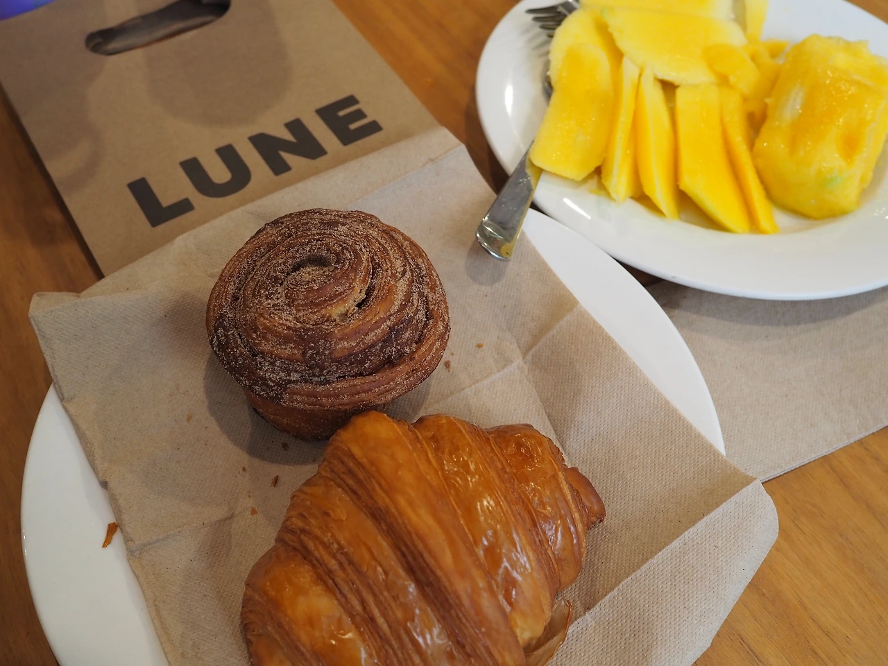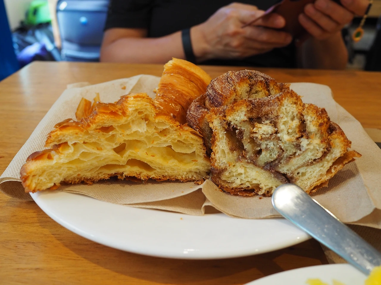 돌아오는 길에 잊지 않고 크로와상 하나와 시나몬롤 하나를 사 왔다. 숙소로 오자마자 접시를 준비하고 망고 하나를 썰어 곁들였다. 엄마가 “우리 1일 1 망고 하네 “하고 말씀하신다. 나는 가끔 엄마의 요샛말 실력에 놀랄 때가 있다. 저런 건 어디서 배우셨지. 숏폼은 우리만 좋아하는 줄 알았는데 엄마도 유튜브를 통해서 열심히 보시더라. 엄마 또래 분들 중에는 숏폼 동영상을 보느라 밤을 새우는 분들도 있단다. 신기한 일이다. 도파민은 연령대에 무관하게 작동하는 모양이다. 우리 다음 세대는 부모 세대가 sns에 모든 것을 전시하는 것에 지쳐서 반-sns 세대가 될 것이라는 얘기를 어디선가 본 적이 있는데, 숏폼은 그때까지 계속 유행할까? 아무튼 숏폼을 그렇게 많이 보지는 않는 나로서는 방금 사 온 크로와상과 시나몬롤이 최고의 도파민이다. 특히 크로와상도 크로와상이지만 시나몬롤이 최고였다. 반으로 가르니 내부가 장미꽃 모양처럼 펼쳐지는데 겹겹이 들어간 시나몬과 설탕이 짜릿하다. 한동안 설탕과 밀가루를 끊은 적도 있었는데 도대체 어떻게 한 것인지 기억이 나지 않는다.