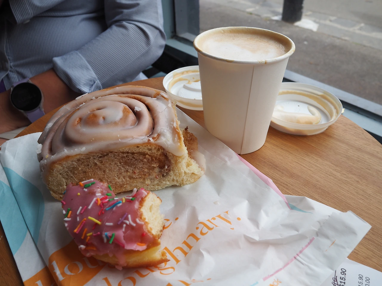 멜버른에서 유명한 것은 도넛이다. 한번 먹어보고 싶던 차에 찾아보니 비스트로 모건(Bistro Morgan)의 스트로베리 도넛이 맛있단다. 커피와 함께 주문했다. 보기에는 그냥 던킨도넛의 도넛과 비슷하다. 필링 없는 도넛 빵 위에 분홍색 딸기 크림을 올리고 스프링글을 뿌렸다. 근데 맛은 아주 상큼하고 신선하다. 딸기 크림의 레시피가 궁금할 정도였다. 배불러서 별 생각이 없다던 엄마는 도넛을 한입 드시더니 시나몬롤도 시키자 하신다. 주문했더니 딸기도넛이 더 맛있다고 하셨지만. 내 입맛엔 둘 다 맛있었다. 그렇지만 시나몬롤은 전날 먹는 룬 크루아상이 훨씬 맛있긴 했다.