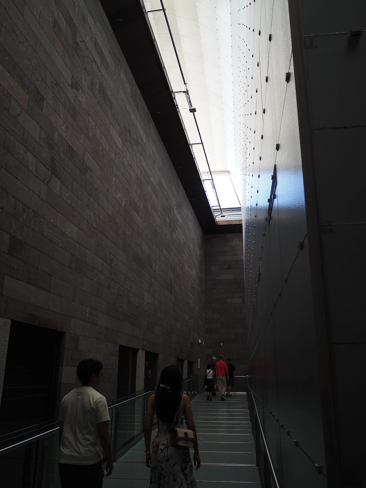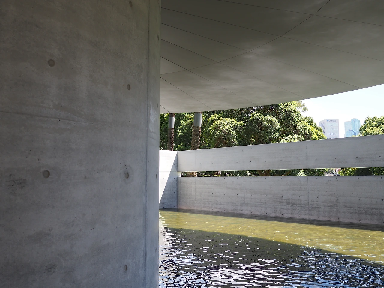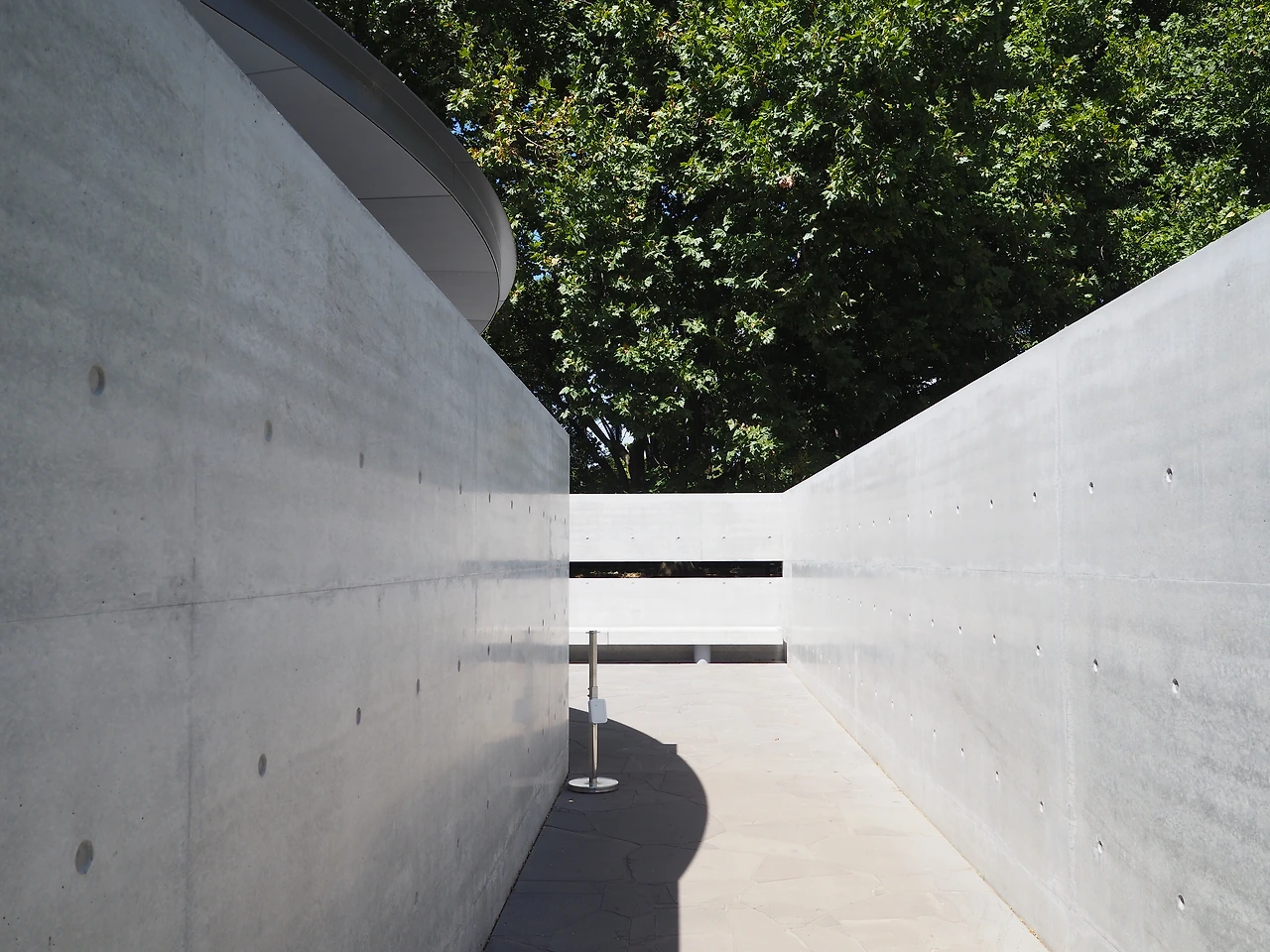 엄마도 안도 다다오와는 구면이다. 1년 전에 함께 제주도 여행을 갔는데 거기서 본태박물관에 함께 갔었다. 멀리서 파빌리온을 보더니 바로 알아보신다. 분위기가 비슷하단다. 역시나 안도의 전형적인 스타일이다. 당연히 노출콘크리트를 재료로 썼다. 네모난 콘크리트 구조물 위에 공간을 두고 둥그런 지붕이 떠 있다. 한 번에 파빌리온 내부 공간이 보이지 않도록 벽을 한 번 꺾어 들어간다. 두 콘크리트 벽 사이로 들어가며 기대하는 마음이 생긴다. 위를 보니 둥근 지붕 아래로 물그림자가 어른거린다. 들어가니 의외로 북적거린다. 소말리아 난민들을 돕기 위한 전통공예 수업이 한창이다. 바닥을 반으로 나누어 절반은 돌바닥으로 되어 있고 나머지 절반은 얕은 물이 담겨 있다. 물가에는 나무 스툴이 놓여 있어 물을 바라보며 명상을 하거나 휴식을 취하기에 좋다. 공원 한가운데 있어 계속 나뭇잎이 떨어지는지 직원 하나가 계속 물속을 걸어 다니며 뜰채를 이리저리 움직이고 있다.