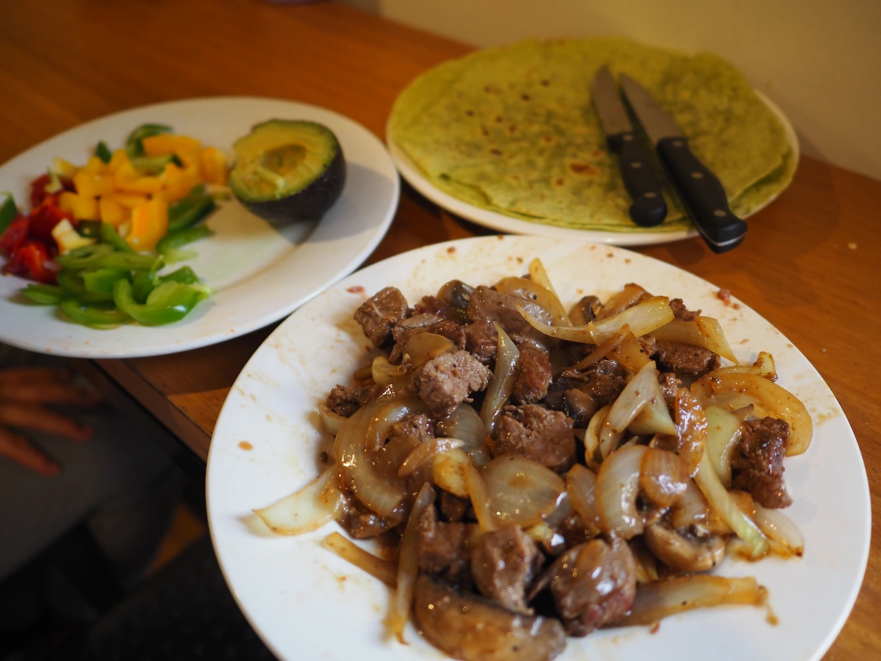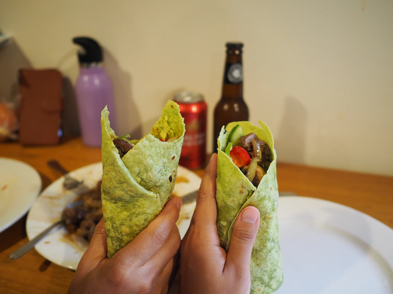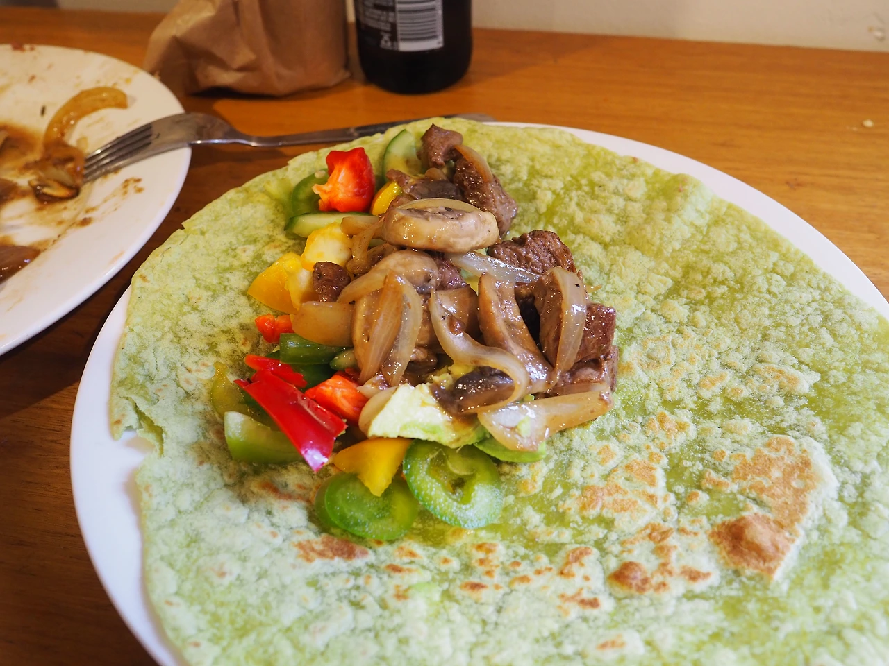 결국 엄마를 어르고 달래 걸어서 오는 데 성공했다. 사실 나도 엄청 지쳤다. 그래도 저녁은 안 먹을 수 없지. 오늘은 고기를 구워 먹어 보기로 한다. 마트에서 허브에 양념된 버터가 들어 있는 양고기 스테이크와 같이 구워 먹을 버섯, 양파 등의 야채를 샀다. 양고기는 초원에서 방목해서 키웠다는 마크가 찍혀 있다. 숙소에 와서 남은 브리또를 굽고, 파프리카와 야채를 얹고, 프라이팬에 구워낸 야채와 찹스테이크로 구운 양고기를 넣어 돌돌 말았다. 남은 양고기 스테이크는 따로 하나씩 집어먹는데, 지방도 별로 없는 고기가 너무 퍽퍽하지도 않고 촉촉하니 맛있다. 맥주와 무알콜 맥주 한 잔씩 하면서 만찬을 즐겼다.