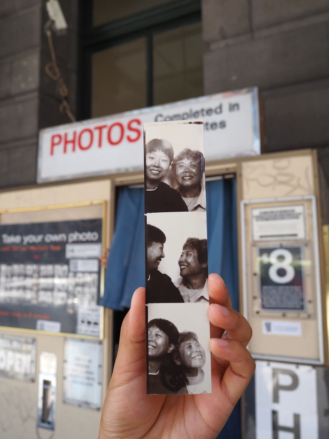 성당 가기 전에 찍으려고 했더니 고장 났다는 메모가 적혀 있었다. 성당 다녀오는 길에 다시 보니 열려 있단다. 엄마랑 숙소 앞에서 만나 바로 즉석사진기로 갔다. 한 뼘밖에 안 되는 짧은 커튼을 친다. 1달러나 2달러 동전을 정확히 8달러어치만큼 넣으면 불이 켜진다. 자리는 아주 좁고 의자가 딱 하나 놓여 있어 엉덩이를 반 쪽씩 걸치고 앉았다. 벌써부터 웃음이 나온다. 집중해서 앞을 보고 표정을 지었다. 플래시가 터지며 찰칵. 또다시 마주 보고 찰칵. 반대편을 보고 찰칵. 그리고 밖으로 나와 3분을 기다린다. 그러면 기계에서 위잉 위잉 소리가 들리고 사진이 딱 한 장 나온다. 마지막 사진은 내 얼굴의 절반이 프레임 밖으로 튀어나가 있고, 사진은 여기저기 얼룩덜룩하지만 완전 옛날 감성 그대로다. 추억의 순간을 남기기에 제격이다. 잉크도 아직 덜 마른 사진을 소중하게 들고 마르기를 기다리며 이동했다.