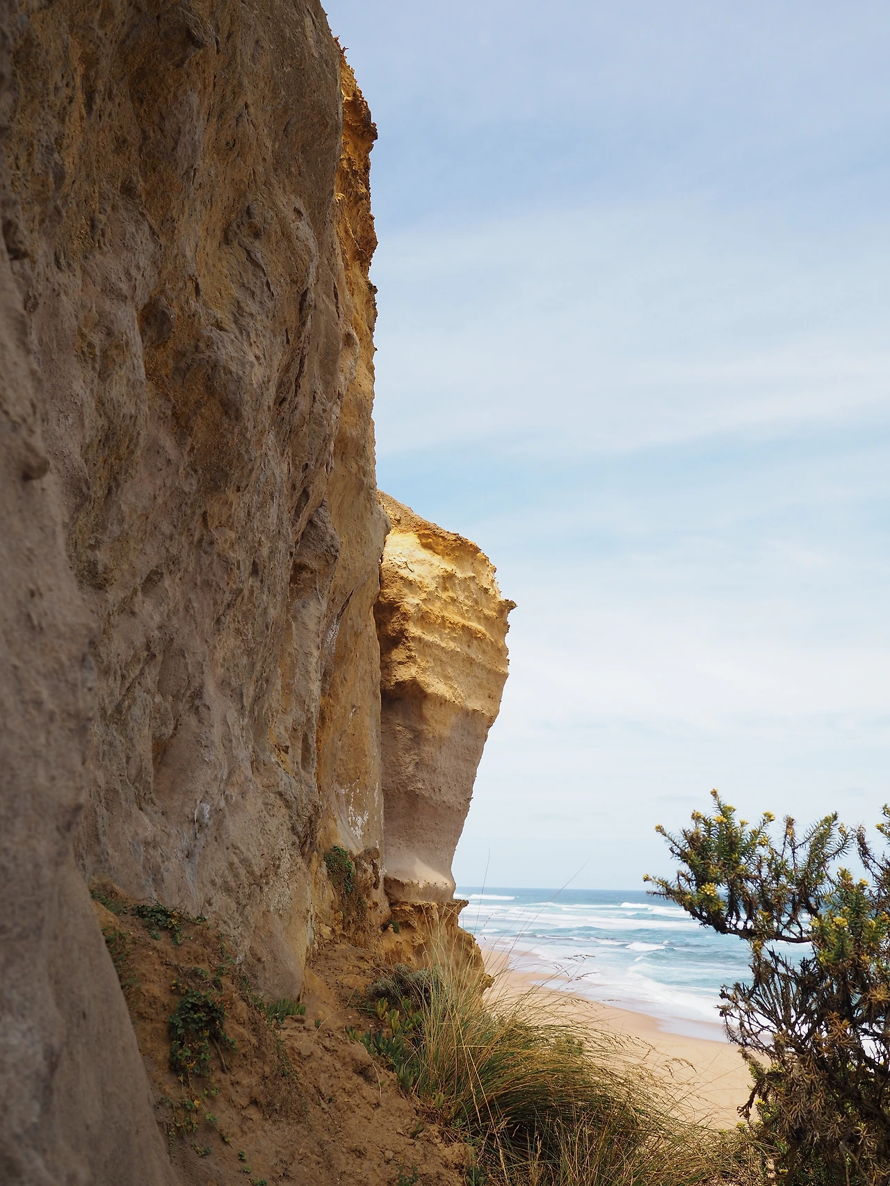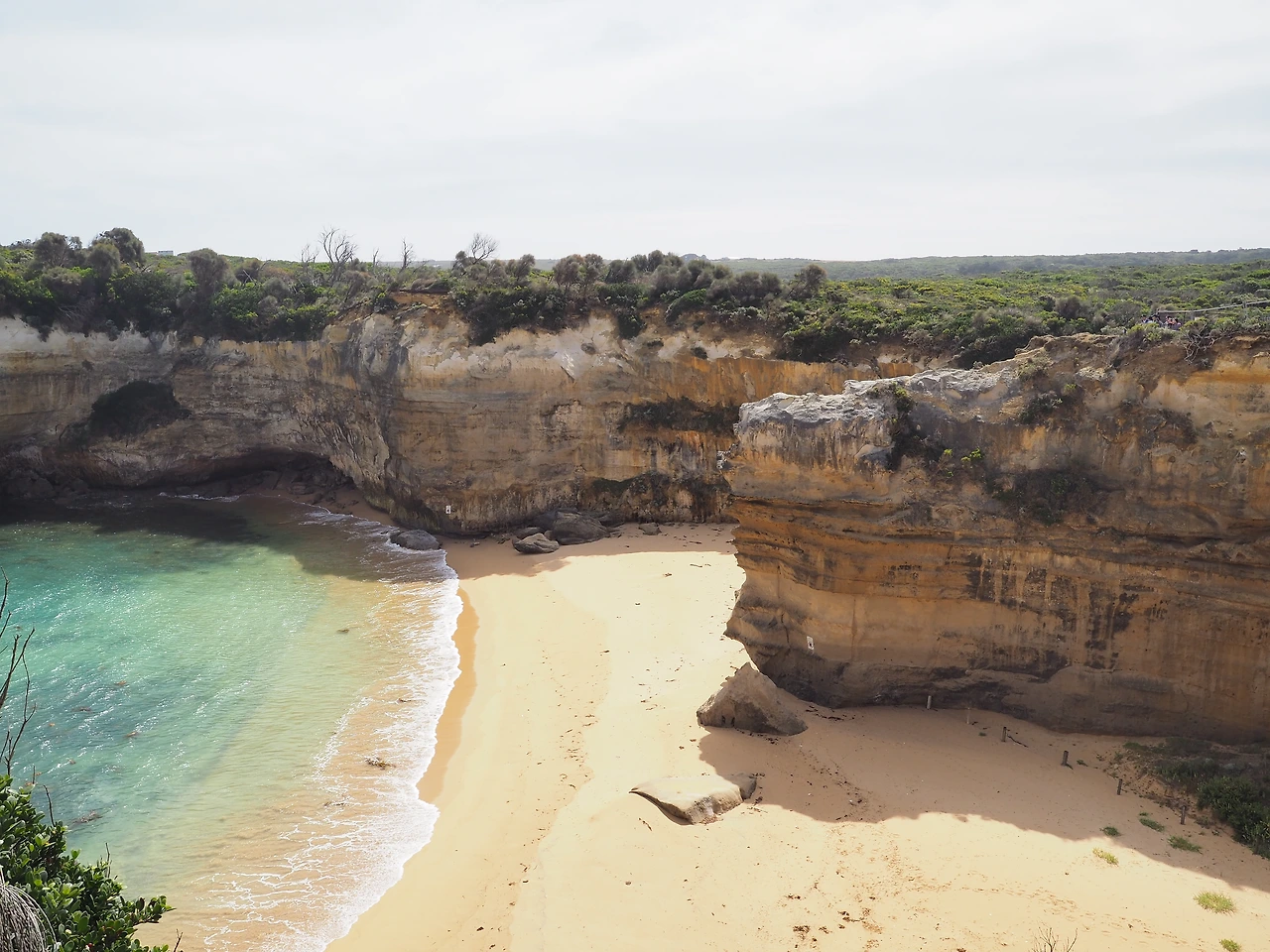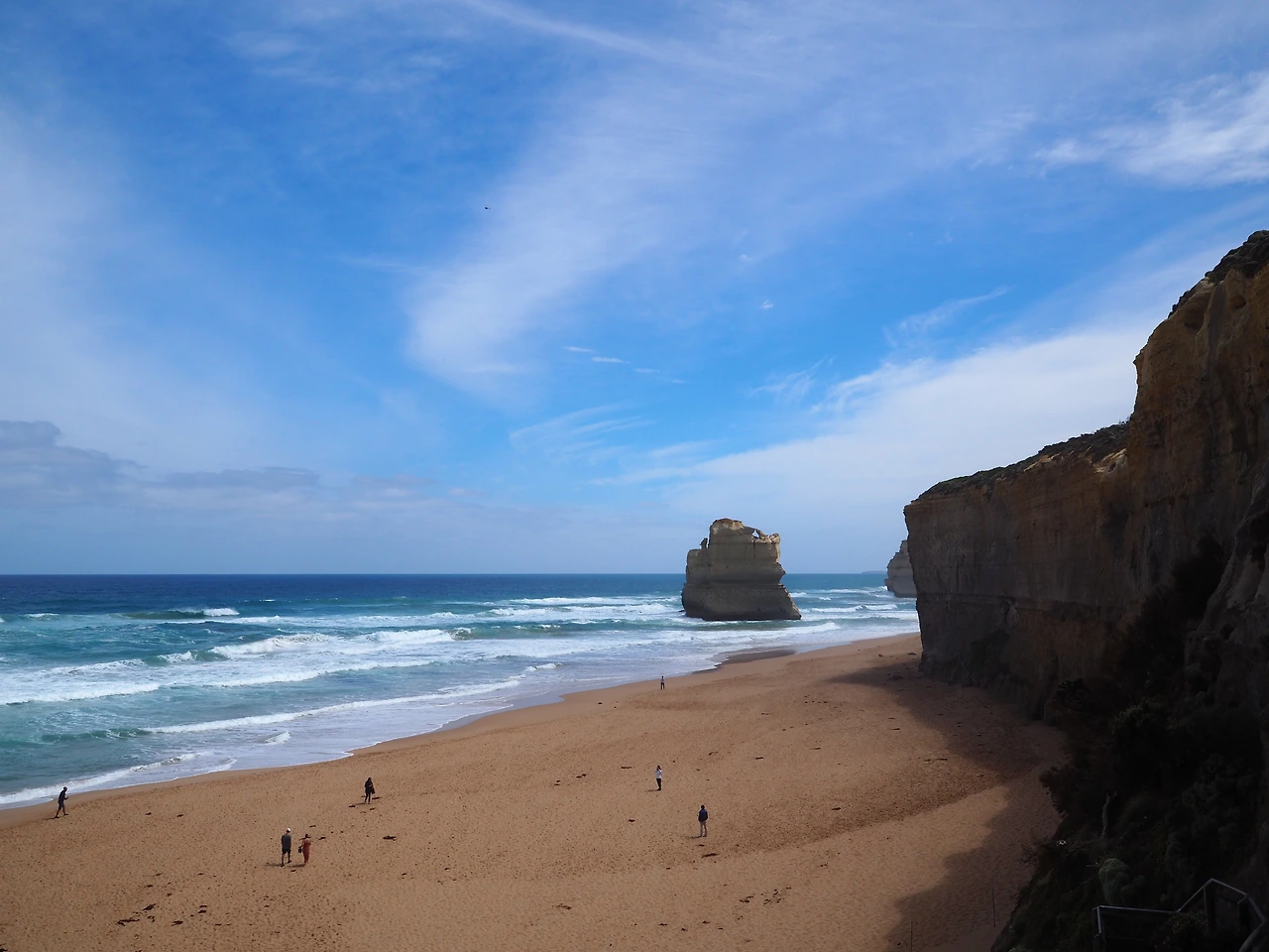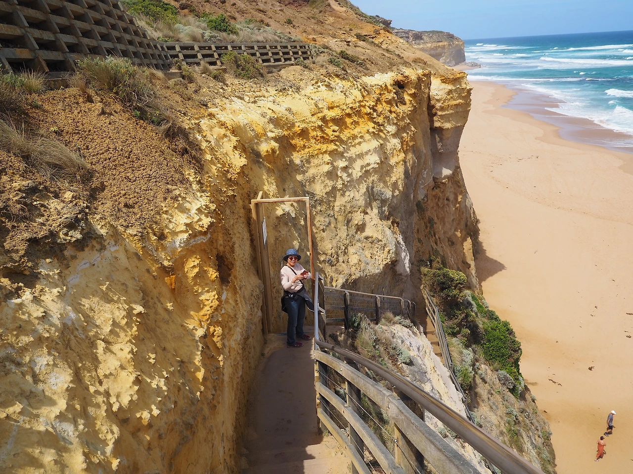 모습은 8 사도가 되었지만 이름은 여전히 12 사도인 이곳은 헬리콥터로 돌아보는 것이 가장 유명한 즐길거리지만, 엄마도 나도 높은 곳에서 굳이 내려다보는 것에는 큰 흥미가 없어 버스에서 내려주는 키오스크에서부터 육지길을 따라 한 시간, 바닷길을 따라 30분을 쭉 걷기로 했다. 키오스크에서 나와 왼쪽으로 가면 육지길(Twelve Apostles Lookouts)이고 오른쪽으로 가면 바닷길(Gibson Steps Lookout Beach)이다. 육지길은 아까 점심식사를 했던 숲길과 비슷하다. 좁고 구불구불한 비포장도로가 끝도 없이 이어진다. 그늘이 제법 있어 걷기에 부담스럽지는 않았다. 다들 바닷길로 갔는지 육지길은 한산하다. 한참을 걷고 났더니 수풀 사이로 바다가 보이기 시작했다. 웬 주차장을 지나니 가파른 절벽을 따라 폭이 좁은 계단(Gibson Steps)이 설치되어 있다. 계단을 따라 반쯤 내려가니 12 사도의 일부인 바위 사이에 고운 모래로 이뤄진 해수욕장이 보였다. 절벽이 어찌나 높은지 아래에 있는 사람들이 미니어처로 보일 지경이다. 12 사도의 높이가 45m쯤 된다고 하니, 이곳도 비슷할 것이다. 아파트로 보면 15층쯤 된다. 절반쯤 내려가다가 다시 올라올 길이 멀 것 같아 걸음을 돌렸다.