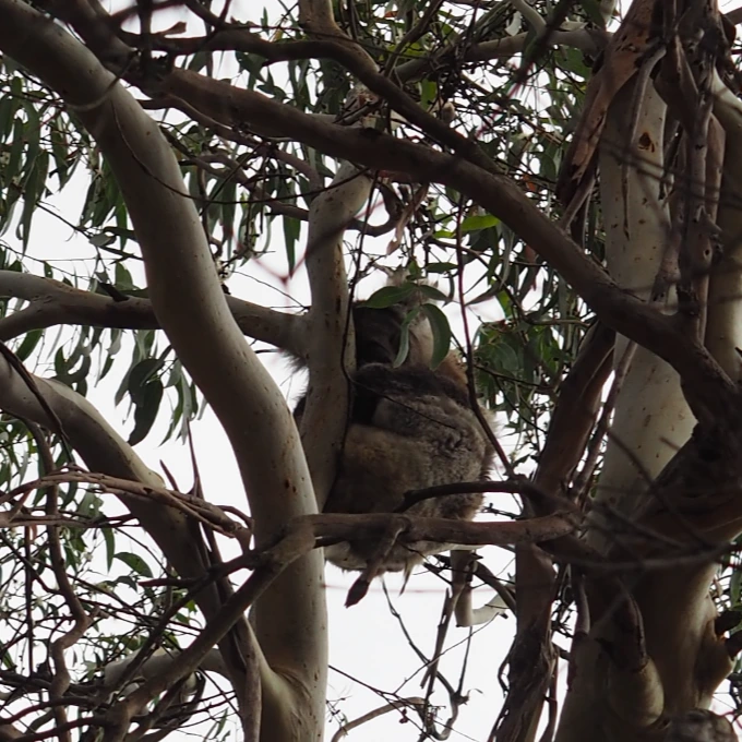 아무튼 정말이지 잠시동안 바다를 즐기고 다시 버스에 올라탔다. 다음 정류장은 야생 코알라 서식지인 케넷 리버(Kennett River)다. 가이드는 야생을 몇 번이나 강조하며, 야생이라는 것은 오늘 코알라를 볼 수도 있고 못 볼 수도 있다는 뜻이란다. 코알라는 하루에 거의 20시간 정도를 자는데, 즐겨 먹는 유칼립투스 등을 비롯한 나뭇잎에 마약 내지는 취하는 성분이 들어있다고 한다. 동물원에서도 관람 공간에 있는 코알라의 2/3 정도가 나뭇가지 사이에서 몸을 둥글게 말고 곤히 자던 것이 생각났다. 대체 이 동물은 어떻게 야생에서 생존할 수 있는 것일까? 의외로 그 답은 쉽게 찾을 수 있었다. 우리가 이곳에서 찾은 코알라는 단 한 마리. 그 한 마리를 찍기 위해 수많은 사람들이 모였지만 대부분 둥그런 엉덩이 혹은 둥그런 털 덩어리에 해당하는 모습만 찍을 수 있었다. 거의 나무 꼭대기에 가까운 자리에서 잠들어 있어 시야에서 굉장히 멀었기 때문이다. 동물원에서는 그 높이가 시야와 비슷했지만 야생의 코알라는 실제로 엄청나게 높은 곳에서 잠을 잔다. 회색과 검정 색이 섞인 털 색은 아래에서 위를 보았을 때 해의 역광과 겹쳐 보호색이 된다. 잘 움직이지 않으니 움직임이 포착되지도 않는다. 아무튼 야생의 코알라도 몹시 귀엽다. 그저 동그랗고 털이 북슬북슬한 모습일 뿐이지만.