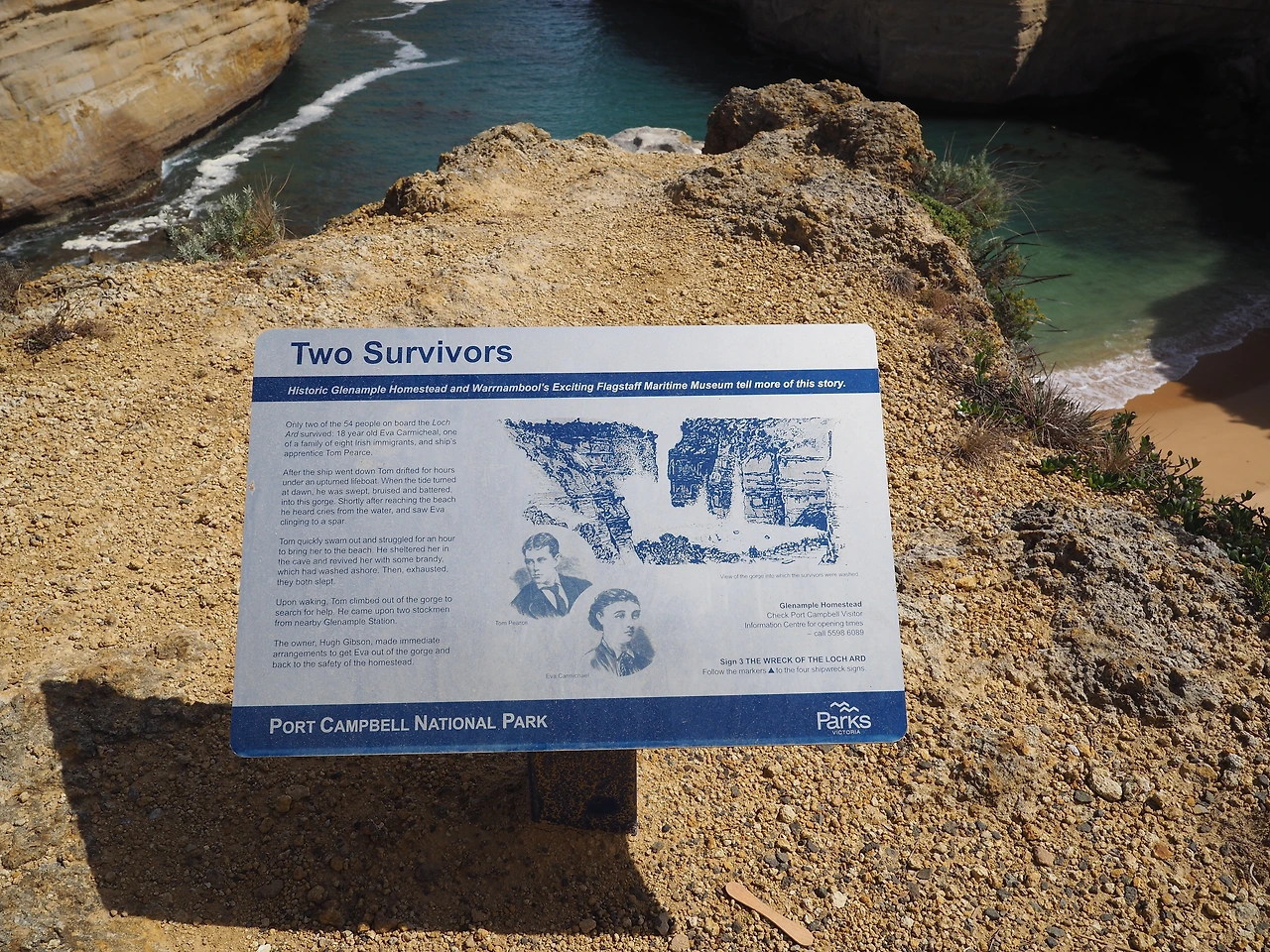 아무튼 차는 계속 서쪽으로 간다. 이번에 갈 곳은 로카드 고지(Loch Ard Gorge)다. 거센 바람이 불고 깎아지른듯한 절벽이 많아 수많은 배들이 난파되었다고 유명한 해안가다. 항해가 위험하니 결국 항을 닫았는데, 로카드라는 배가 1878년에 가장 마지막으로 이곳에 와서 난파당했다고 한다. 로카드의 유일한 생존자였던 톰과 에바가 며칠간 해안가에 고립되었다. 둘 다 10대 청소년이었는데 (모두의 기대와 달리) 비극적인 상황에서 애정이 싹틀 만도 했건만 신분차를 극복하지 못하고 결혼에 이르지 못했다고 한다. 아무튼 이 해안에는 둘의 이름을 딴 전망대가 있다. 내가 에바였다면 내 이름 내려달라고 했다. 전망대 안내판에는 두 젊은이의 얼굴까지 새겨져 있다.