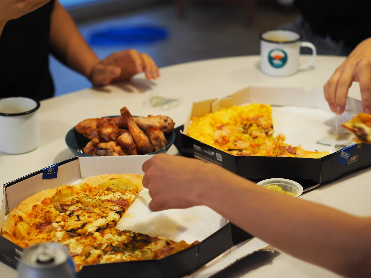 숙소로 돌아와 린지 님과 아침에 나눴던 이야기를 바탕으로 두 명의 인터뷰이를 더 섭외했다. 평상 위에서는 낑깡이와 인절미가 담요에 둘러싸여서 마치 한 고양이처럼 누워 있었다. 앞에 나온 머리는 분명 인절미인데 뒤로 나온 발은 낑깡이다. 열어보면 두 마리인데 닫아놓고 보면 한 마리인 것은? 아무래도 고양이지. 회의를 하고 있는 팜프라 식구들을 배경으로 노트북을 두들기고 있는데 갑자기 도시의 음식이 먹고 싶다. 한식과 양식 쿨타임이 따로 작용하는 것이 나의 입맛인지라. 입 밖으로 "피자 먹고 싶어요"를 내뱉으니 갑자기 다들 맛있겠다며 합세했다. 결국 저녁에 오는 손님에게 피자 픽업을 부탁했다. 피자는 오늘 나보다 먼 거리를 움직여 우리 식탁에 올랐다. 삼천포에서 출발해 남해에 온 피자와 치킨이다. 어머니들의 사랑으로 차린 밥상도 맛있었지만, 이렇게 속세의 맛도 오래간만에 먹으니 아주 행복하다. 어느새 밖에는 어스름이 깔려있다.