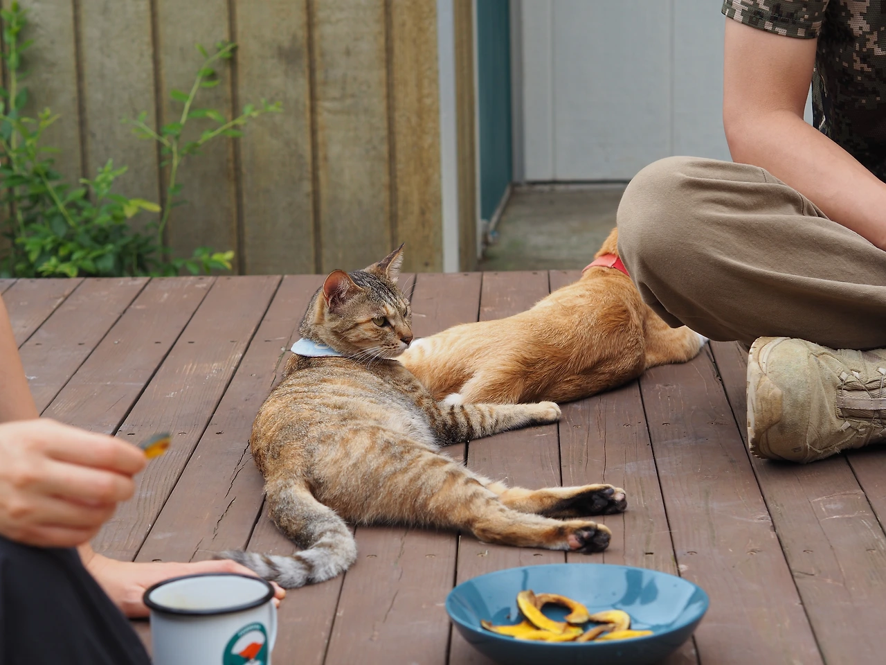 방으로 돌아와 샤워를 마치고 미적미적 방에서 나왔다. 밤새 비가 왔었는지 두모천 물소리가 거세다. 라운지로 와보니 폴더창을 다 열어두고 환기를 하고 있다. 고양이들도, 사람들도 밖으로 나와 평상에서 바깥공기를 즐겼다. 린지 님이 에어프라이기에 구워주신 단호박이 너무 달고 맛있다. 인절미는 누워서 놀다가 린지 님에게 잡혀서 귀 검사를 받았다. 잠시 린지 님과 인터뷰 내용 관련해서 이야기를 나눴다. 사진을 전공한 린지 님은 남해에 사는 이주 여성들을 연령대별로 인터뷰하고 사진을 찍어 책으로 내고 싶단다. 60-80대 이주 여성들은 대체로 근방의 마을에서 마을로 결혼하며 이주한 경우가 많고, 그보다 어린 40-50대 여성들은 자동차가 보급되며 근처 도시에서 남해로 이주한 경우가 많다고 한다. 또, 20-30대들은 결혼과 무관하게 이주하여 자아실현을 하며 살고 있다. 이들의 이야기가 흥미롭다. 나의 논문 주제와 겹치기도 한다. 몇몇 인터뷰이는 함께 만나보기로 했다. 린지 님은 남해 사람들과 나를 제일 많이 이어주는 든든한 조력자다.