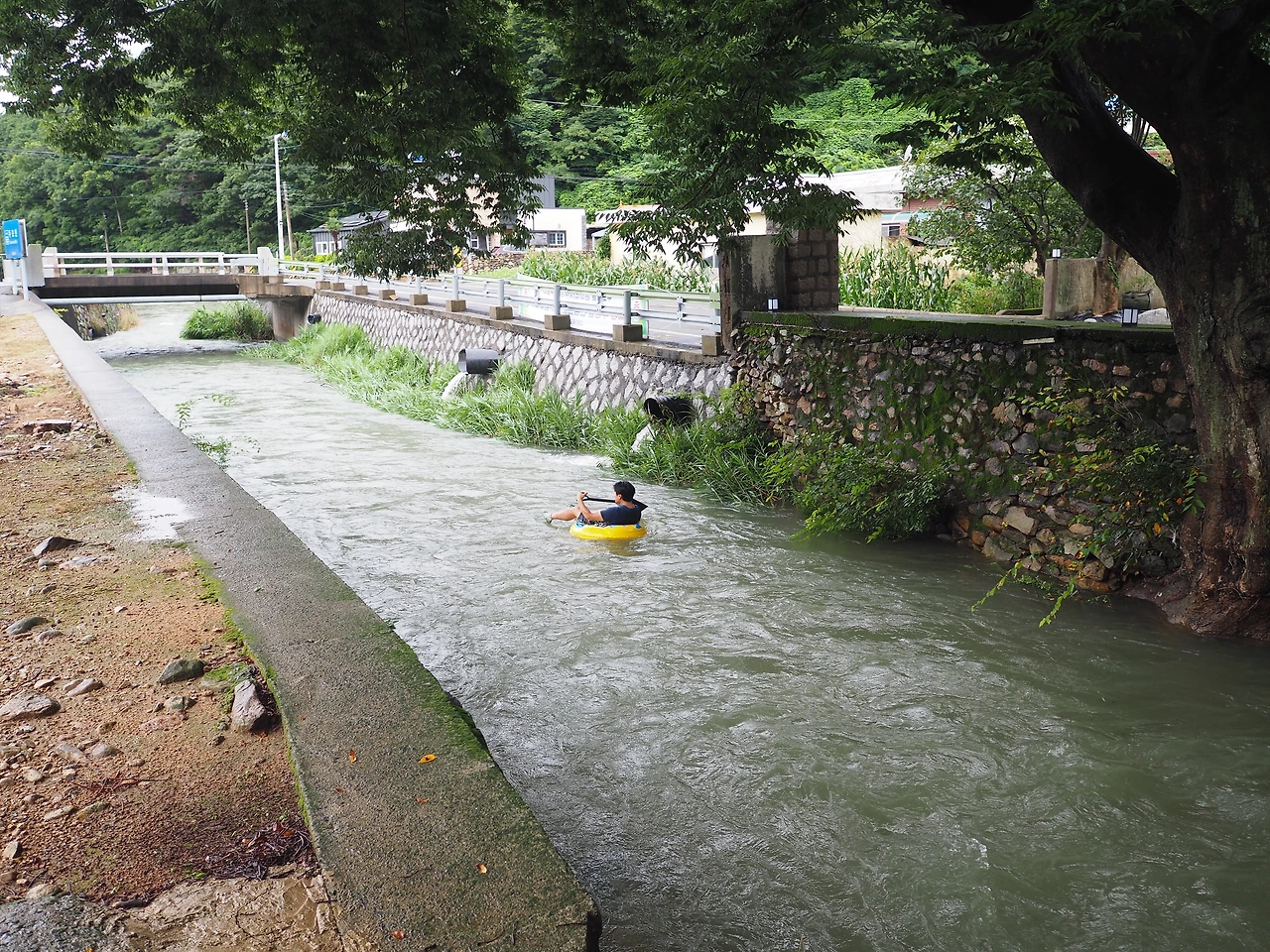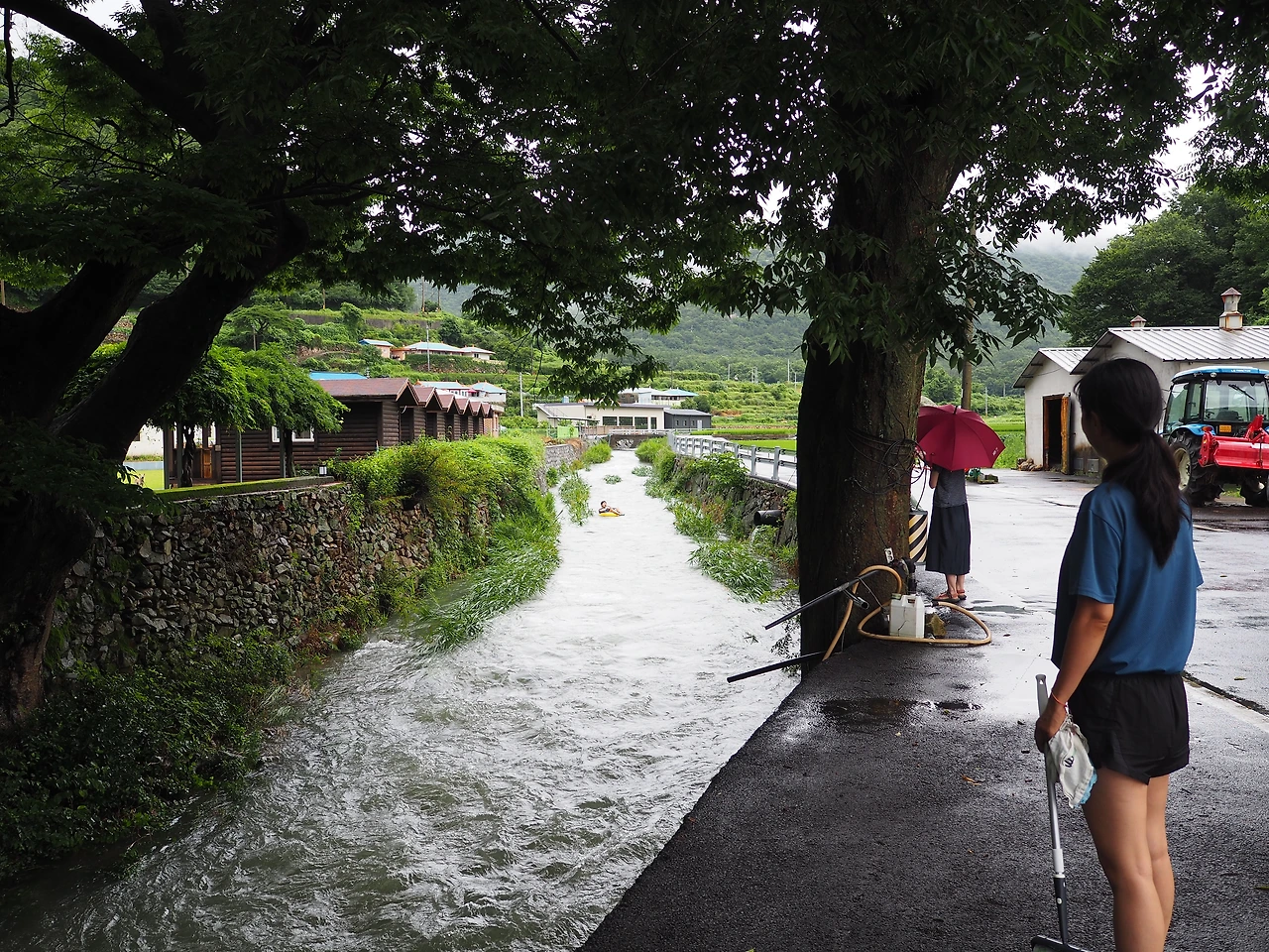 유정 님, 린지 님과 함께 나가서 조마조마한 마음으로 튜브 타는 다형 님을 지켜봤다. 유속이 느린 당산나무 근처에서 하천으로 내려가 다리 앞까지 한번 타고, 그 다음에 다시 다리 앞에서 타서 체험관 근처까지 내려갔다 온 모양이다. 농부는 농부인지, 노 대신 삽을 들었다. 지나가던 동네 할머니께서 "저 바보는 바다까지 떠내려가면 어쩌려고 그러냐"하며 걱정하셨다. 다행히 다친 곳 하나 없이 뭍으로 올라왔다. 죽을 것 같진 않지만 다치지 않을 자신은 없어서, 지켜보다가 슬쩍 합류해보려던 마음을 접었다.