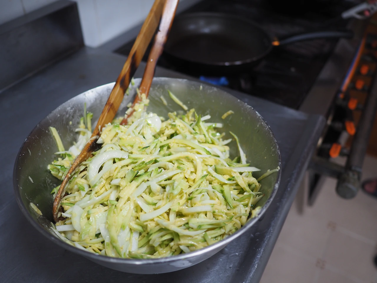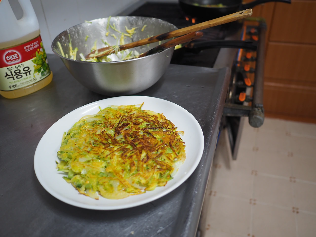 비도 오는 김에 저녁에는 애호박전을 부쳐보기로 했다. 동그랗게 썬 애호박을 부치는 게 아니라, 채 썬 애호박을 부치는 방식이다. 어머니가 보내준 커다란 애호박을 두 개 썰고, 양파도 두어 개 더했다. 마침 숙소에 손님들이 와서 같이 나눠먹었다. 커다랗고 두툼하게 부쳐낸 애호박전은 달고 맛있다. 시중에 파는 예쁜 애호박처럼 생기지 않았지만, 과육이 훨씬 달고 부드러워 전으로 부쳐내면 이보다 맛있는 게 없다. 전을 부칠 때에는 여유가 필요하다. 달궈진 팬에 기름을 두르고 반죽을 올린 다음 잠시 핸드폰을 만지며 논다. 슬슬 팬에서 전이 스스로 움직일때 쯤 뒤집고, 또 한참을 기다린다. 바삭함을 위해 부침가루 반, 전분가루 반을 넣는다. 물은 따로 넣지 않는다. 애호박에서 물이 나오니까. 여름철 별미다.