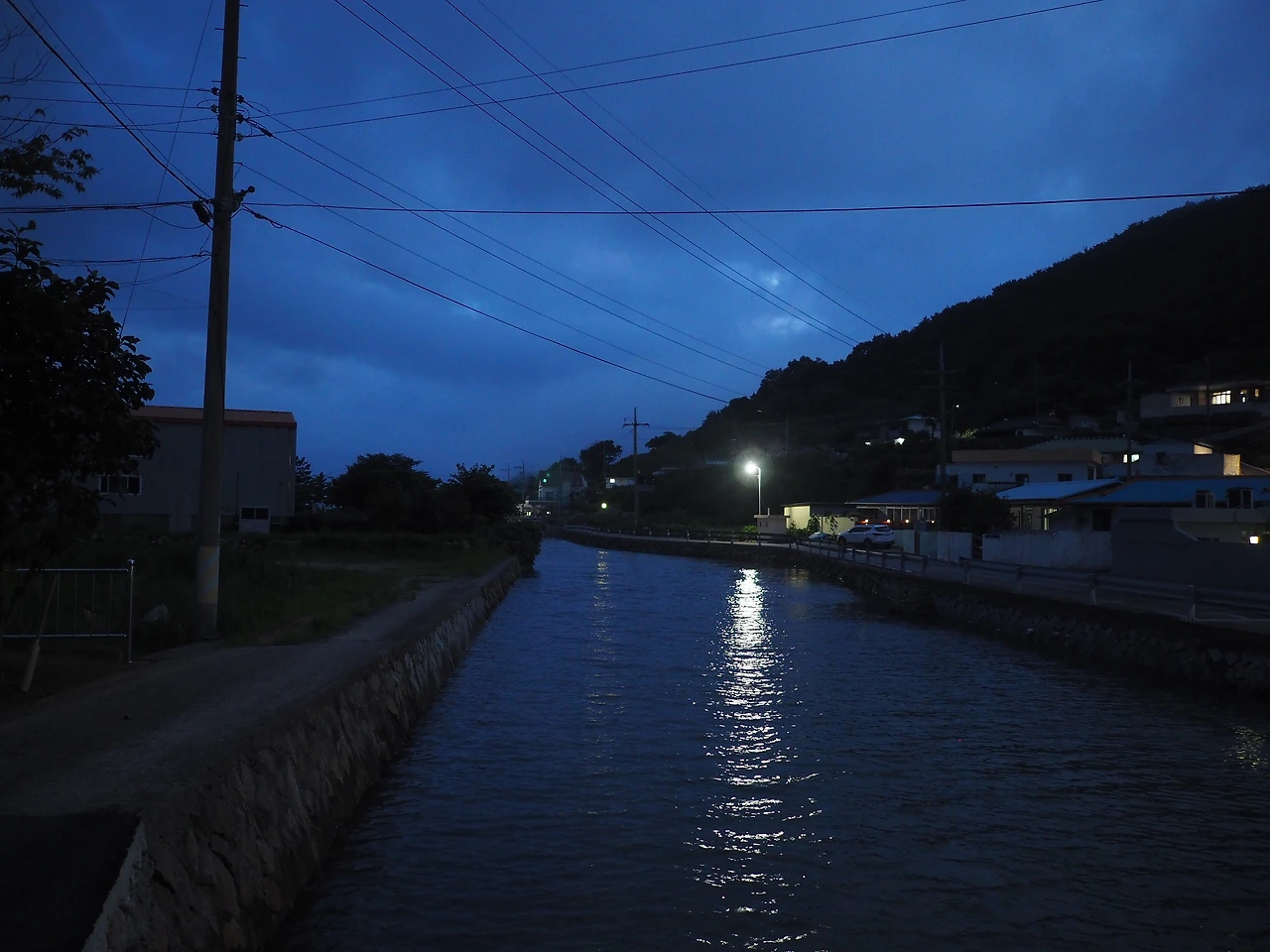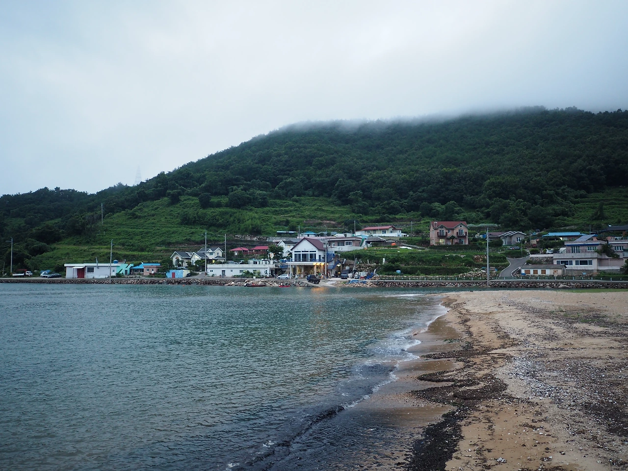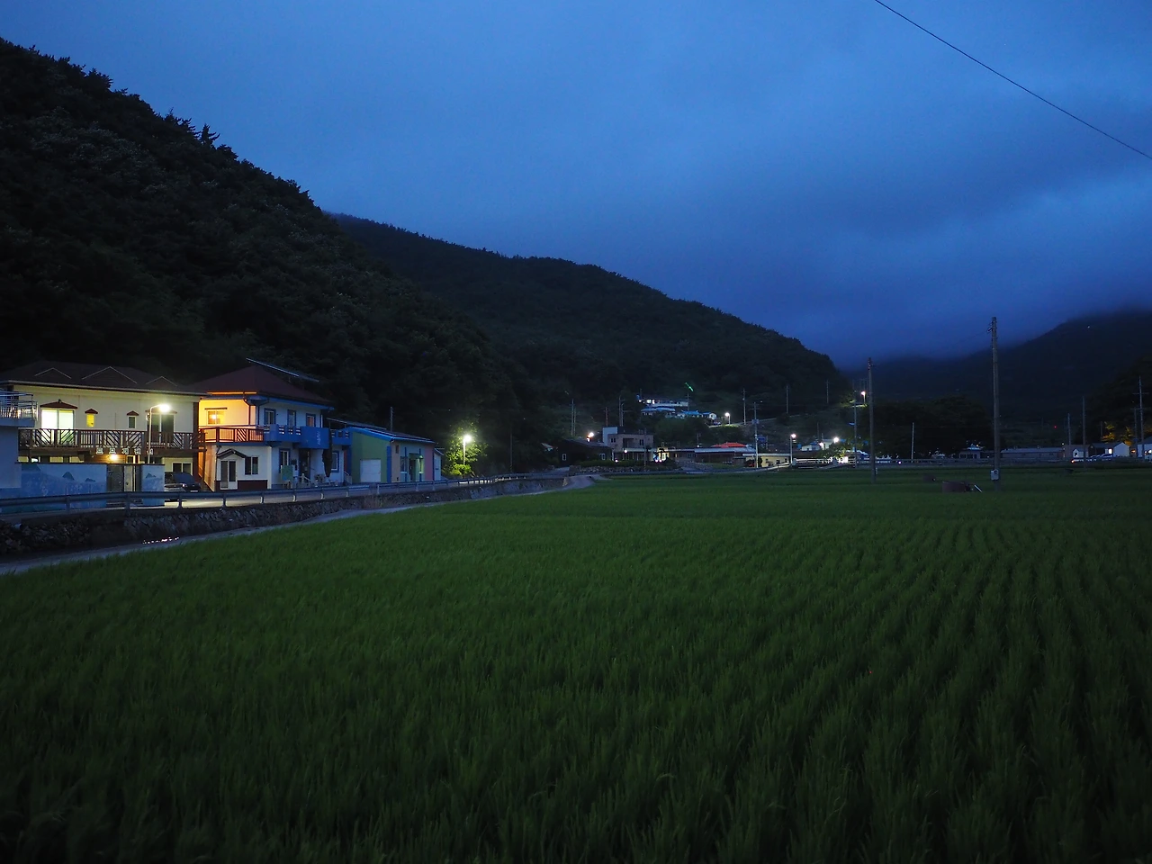 배부르게 먹고 다시 산책을 하다가 방으로 돌아왔다. 시간을 확인해 보니 해 질 녘이다. 산책이 부족한 느낌이라 두모마을 앞 방파제까지 걷기로 했다. 마을에서 운영하는 물놀이장에 아이들이 잔뜩 놀러 와 웃음꽃이 피어있었다. 방파제 위에는 낚시꾼들이 즐비하다. 이제야 피서지가 된 것 같다. 마을을 향해 놓인 돌계단에 앉아 잠시 이야기를 나누며 가져온 물을 마셨다. 하늘이 조금씩 어두컴컴해진다. 하루종일 구름 속에 갇혀있던 하늘에 구름이 밀어낸 틈새가 생기며 한 뼘만큼의 햇살이 들어왔다. 조용한 마을을 지나 논길을 걸어 돌아왔다.
