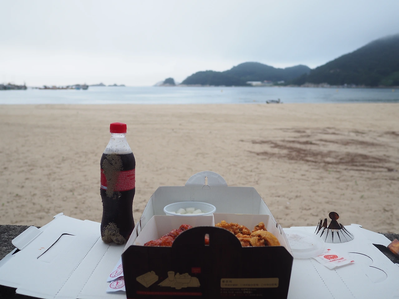 언니와 해변을 따라 걷다가 한산한 곳에 자리를 잡았다. 각자 가져온 책을 읽으며 한가로이 시간을 보냈다. 그래도 이렇게 나오길 참 잘했다는 생각이 든다. 가끔은 일어나서 스트레칭을 하며 바다를 구경했다. 여섯 시가 되니 슬슬 출출해진다. 아까 차를 타고 오며 봤던 멕시카나 치킨이 생각났다. 전화로 주문을 하고, 상주중학교 운동장 앞 해변 쪽 도로라고 설명했더니 잠시 후 정확한 위치로 배달이 왔다. 바삭하지만 입천장을 다치게 하지 않는 아주 맛있는 치킨이었다. 시원한 무절임도 통 하나 가득 함께 왔다.