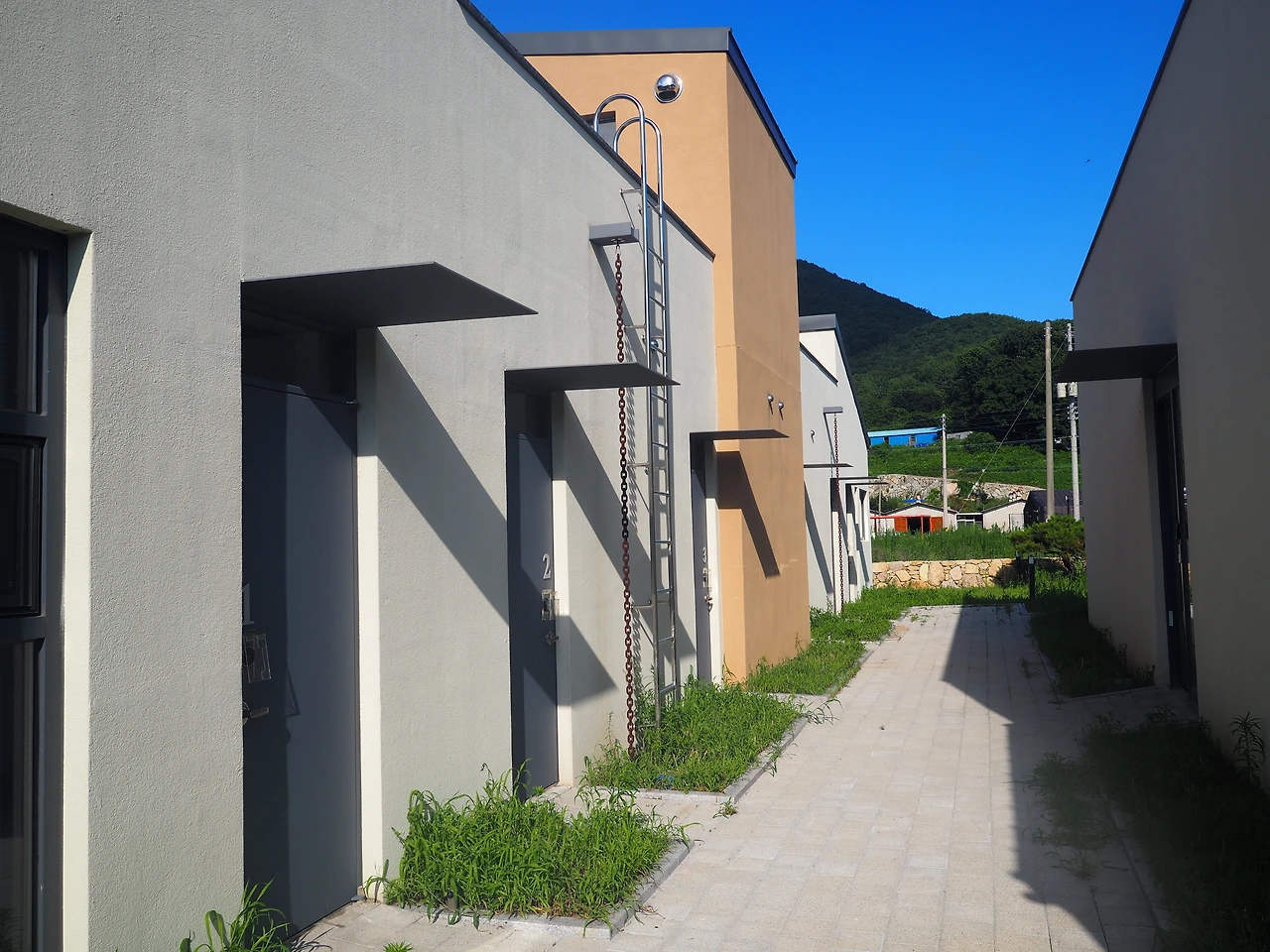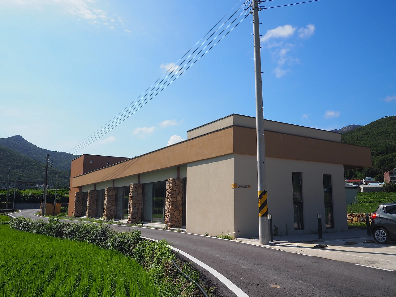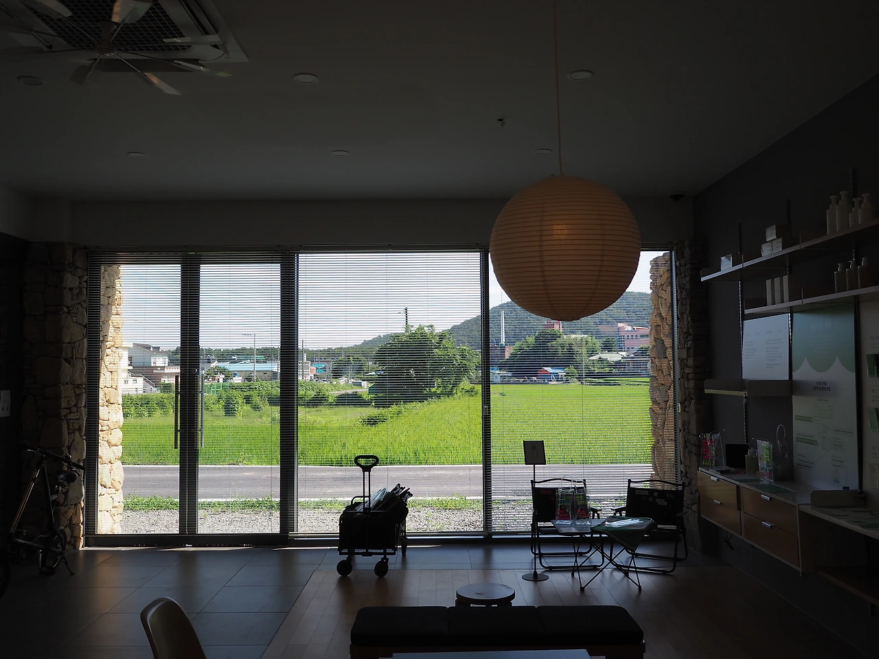 오늘 오후에는 인터뷰가 두 건이 잡혀 있다. 이제 남해에서 지낼 날이 많이 남지 않아 마음이 조급해진다. 언니는 수진 님 차에 태워서 송정 솔바람 해변으로 서핑하라고 보내고, 나는 차를 따로 몰고 '소도읖'이라는 이름의 워케이션 센터로 향했다. 소도읖은 은모래비치 근방에 위치해 있는 곳인데, 기존에 농지였던 곳을 개발해서 숙박업을 운영하고 있다. 바람에 따라 하늘하늘 흔들리는 파란 논 위에 서 있는 건물의 모습이 멋지다.