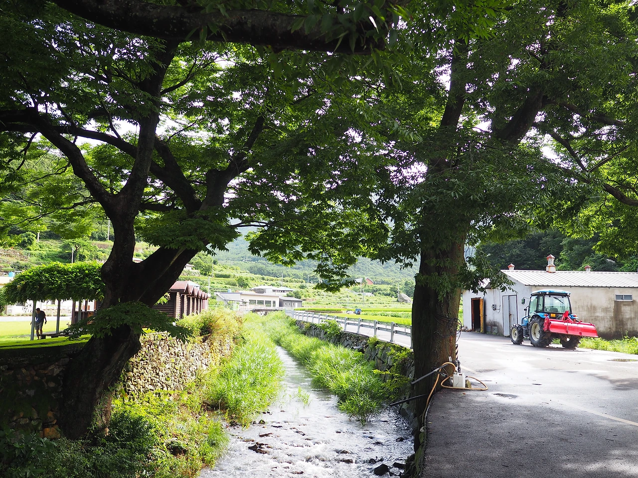 새벽에 비가 많이 내리더니 아침이 되니 하늘이 맑게 갰다. 이런 파란 하늘은 장마철 남해에서 보기 드물기 때문에, 무조건 밖으로 나가야 하는 날이다. 두모천에도 윤슬이 비치고, 저 멀리 금산 꼭대기도 맑게 보인다. 오래간만에 아침식사를 운치 있게 해 보기로 했다. 아이스박스에 자두, 두유, 삶은 계란, 디저트를 넣고 뜨거운 물을 담은 전기포트와 우리원에서 받은 누룽지도 챙겼다. 그리고 두모마을 보호수 아래에 있는 평상에서 아침 피크닉을 즐겼다. 바로 옆에 두모천이 지나가니 마치 계곡에 피서 온 느낌이다. 배불리 먹고, 그대로 평상에 앉아 책을 읽었다. 햇볕은 뜨겁지만 바람은 시원하다. 보호수가 내린 축복이다. 앉은자리에서 <참을 수 없는 존재의 가벼움>을 다 읽었다.