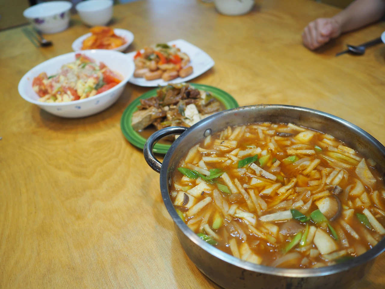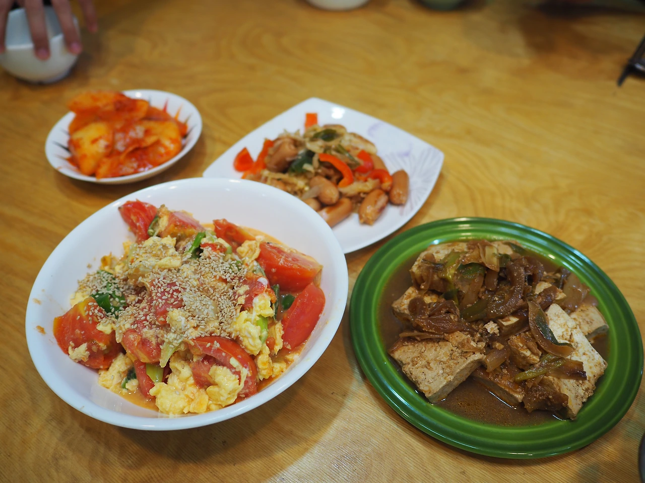 시간이 다 되어 언니는 평상에서 더 쉬라고 두고, 라운지로 향했다. 오늘은 객실 청소가 많은 날이다. 언니한테 빌린 손수건을 머리에 질끈 동여매고 환기를 하고, 빨랫감을 걷어내고, 청소기를 돌리고, 걸레질을 하고, 먼지를 털고, 이불을 정리했다. 두 채를 정리하고 나니 배가 고프다. 한 채 분의 객실 청소를 남겨두고 점심을 먹으러 공동주방으로 향했다. 언니가 팜프라 식구들도 같이 먹자며 된장찌개와 토마토 달걀볶음을 해놓았다. 전날 밤 린지 님이 해두신 소시지 채소 볶음과 두부조림도 함께 내놨다. 한상 가득 소화도 잘되고 맛도 좋은 음식이 차려졌다. 이상하게 먹어도 먹어도 음식이 한없이 들어가는 날이다. 더위를 먹었나.