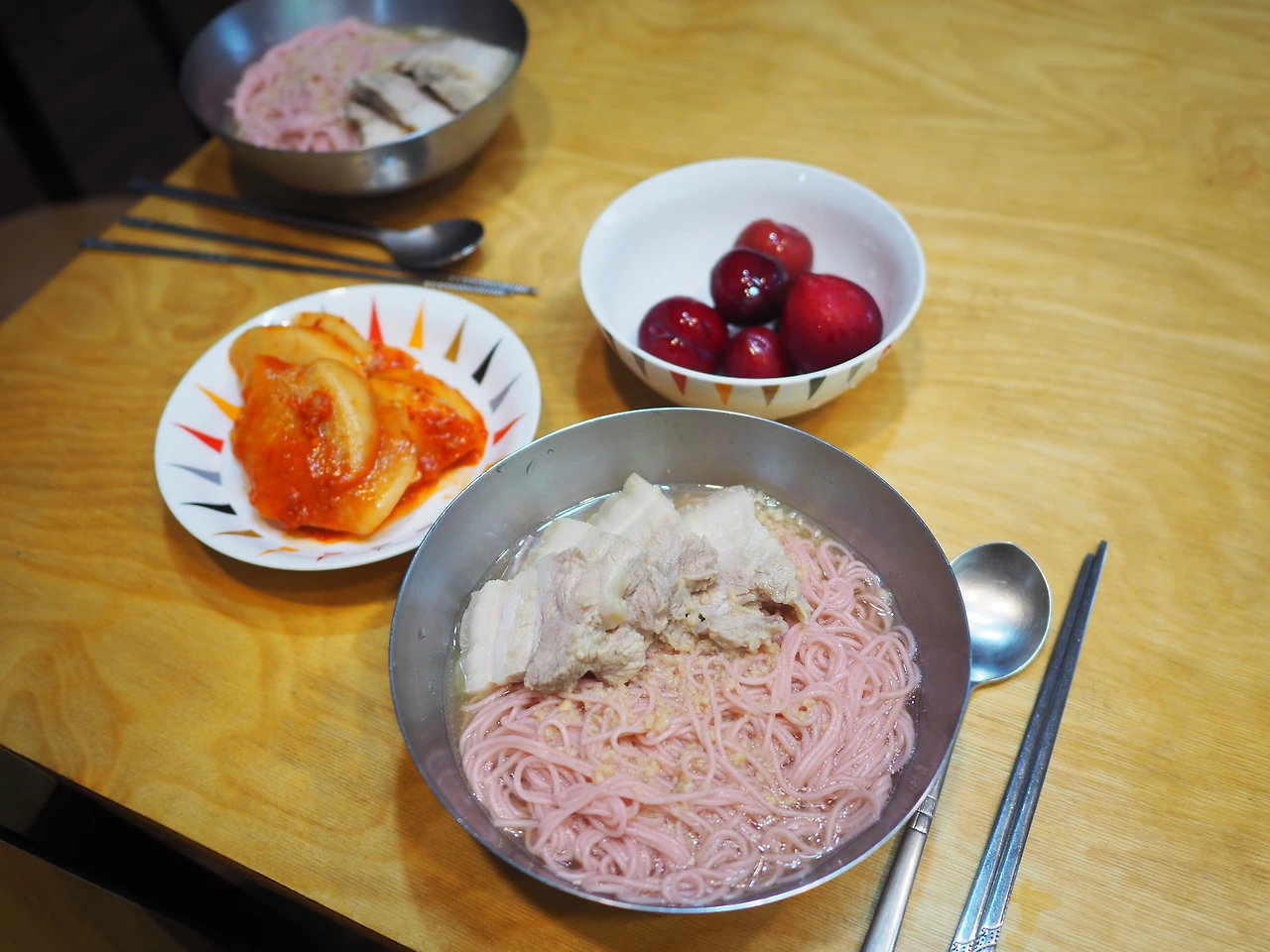 인터뷰를 마치고 다시 주방으로 향했다. 대학원 동기 친구가 싱가포르에 다녀오며 내 부탁으로 싱가포르식 돼지갈비탕인 '바쿠테'의 양념을 사다 줬었다. 전에 싱가포르 여행을 다녀와서 맛있게 먹은 기억이 있어 팜프라 식구들과 나눠먹으려고 챙겨 왔었다. 냉동실을 찾아보니 수육용 오겹살이 있어 뜨거운 물에 한번 삶아내서 건졌다가 다시 물을 끓여 넣고, 바쿠테 양념과 다진 마늘, 간장 등을 넣어 한 시간 가까이 끓였다. 오겹살을 적당한 두께로 썰어서 다시 넣으니 완전 국수 없는 고기국수다. 아무래도 소면을 넣어야겠지. 언니가 챙겨 와 준 백년초 국수를 삶아 국물에 넣고, 지황 님 어머니가 보내주신 섞박지를 꺼내 곁들였다. 영혼을 채워주는 고기국수, 아니 바쿠테다.