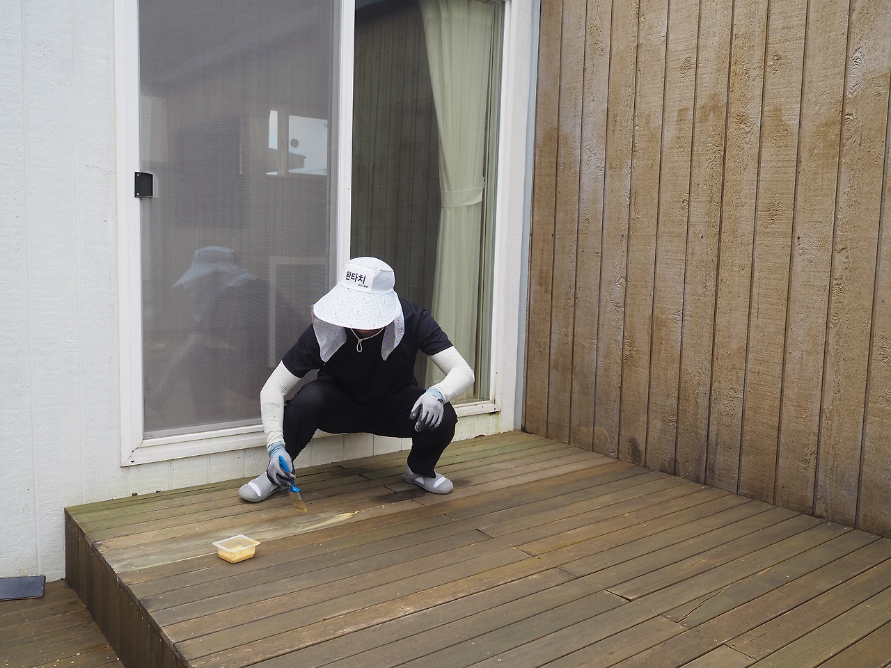 먼저 고압 살수 기계로 물을 뿌려 데크를 씻어내고, 붓으로 데크 한 줄 한 줄을 칠하는 작업을 했다. 기온은 28도 정도로 높지 않은데 오래간만에 해가 쨍쨍하여 폭염주의보가 내려진 상황이다. 태양열로 인한 화상을 방지하기 위해 긴 바지를 입고 긴 양말까지 챙겨 신은 다음에, 팔에는 팔토시를 하고 목 뒤까지 가릴 수 있는 농사용 모자를 착용했다. 땀이 줄줄 흘러내릴 게 뻔하니 모자 안에는 손수건으로 이마를 동여맸다. 셀카를 찍어 모습을 보니 영락없는 농사꾼이다.