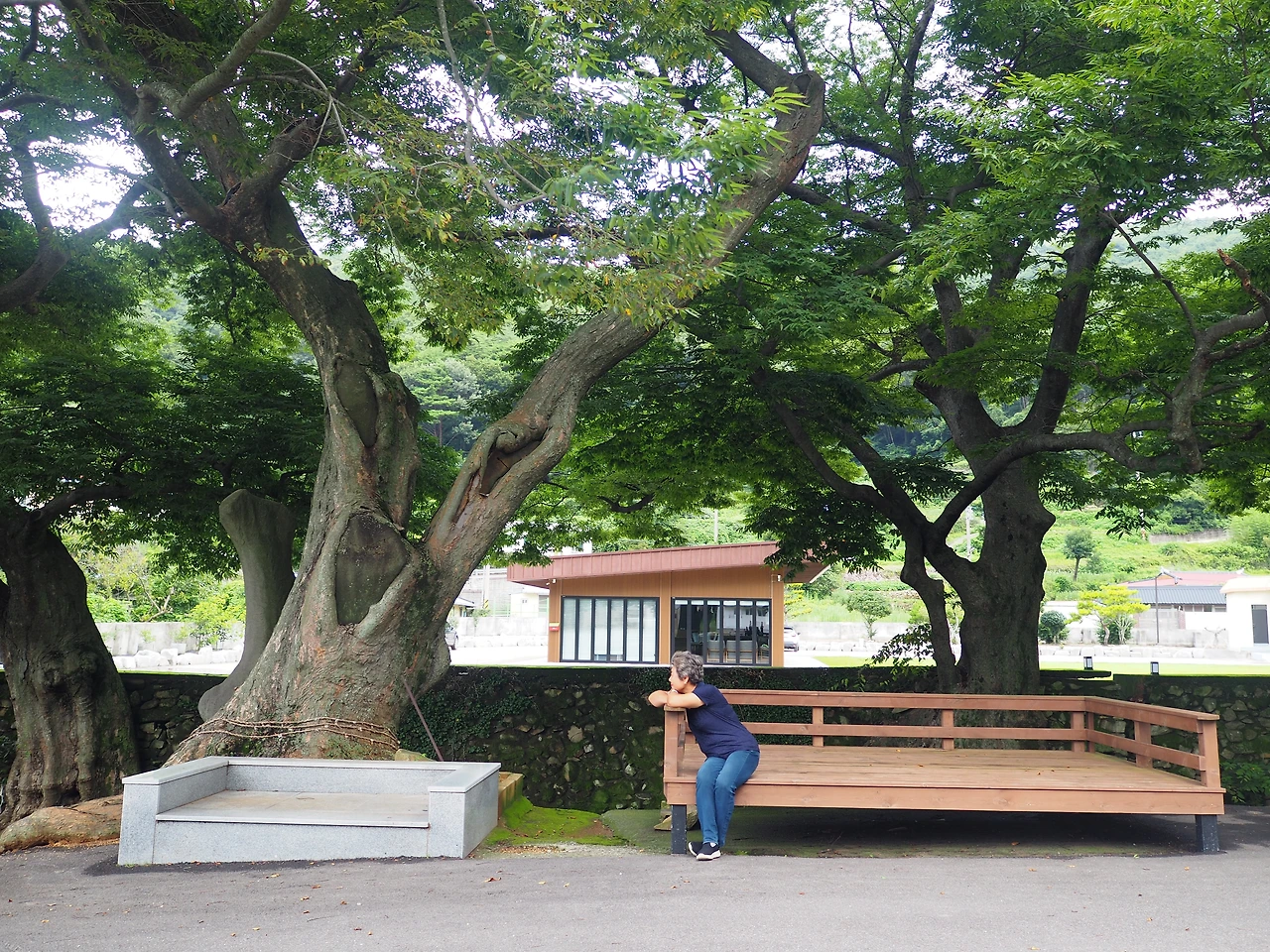빨래를 정리하고, 다시 숙소로 돌아가 엄마의 짐을 차에 실어드리고 나서 당산나무 앞으로 나왔다. 여느 때처럼 평상 위에는 시원한 바람이 분다. 엄마는 사진 포즈가 정말 자연스럽다. 평상의 난간에 기대어 당산나무를 쳐다보신다. 일회용 카메라로 한번, 디지털카메라로 다시 한번 찍어드렸다. 수령이 200년이 넘었다는 이 나무는 정말 듬직하게 서서 마을을 지키고 있다. 엄마와 외할머니를 같이 찍어드리는 기분이었다.