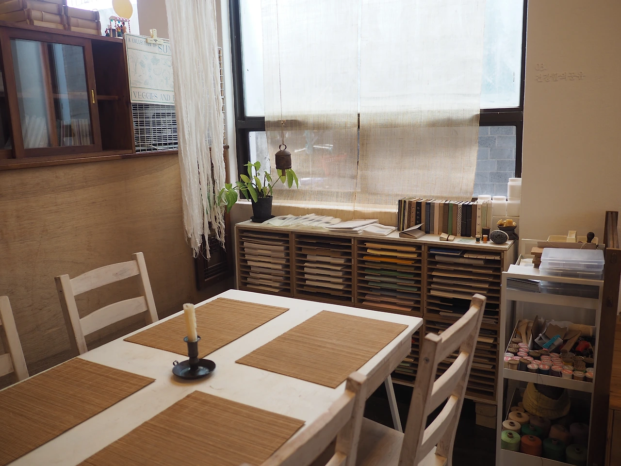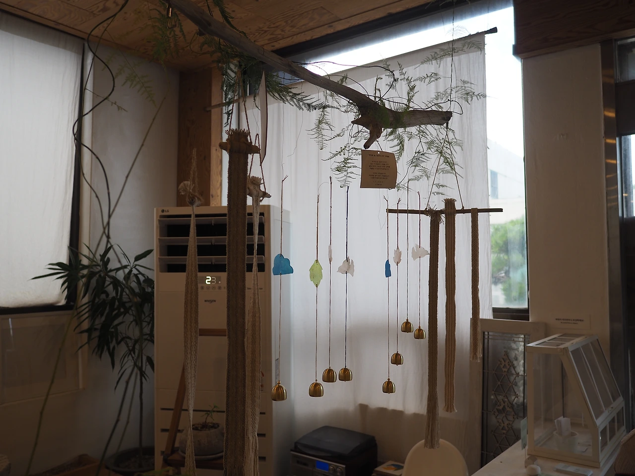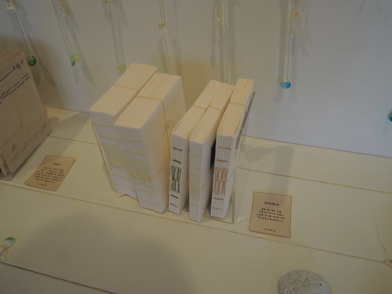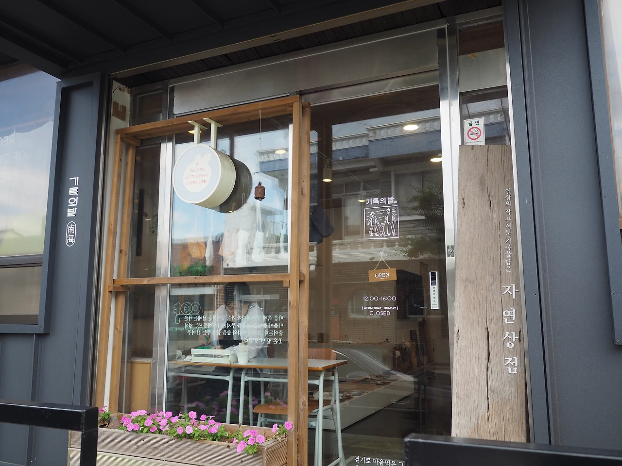 기록의 밭은 세 가지 공간으로 나뉘어 있는데, 상점 공간과 전시 공간, 테라스 공간이 그것이다. 상점 공간 한쪽 구석에는 테이블과 바인딩 재료들이 놓여있었다. 어쩐지 마음이 푸근해지는 풍경이다. 전시된 제품들 사이사이에 바다에서 난 재료로 만든 작품들이 매달려 있다. 전시 공간에는 사장님이 찍은 남해의 사진들과 기록이 전시되어 있다. 한쪽 가득 메운 남해 사진들에서 사장님의 남해에 대한 애정이 느껴진다. 낮고 귀여운 통로를 지나 밖의 테라스로 나가면 바다 냄새가 물씬 난다. 이곳 바로 앞에는 그 유명한 죽방렴이 있다. 작은 정원에서도 바다향기가 나는 것이 남해의 매력이다.