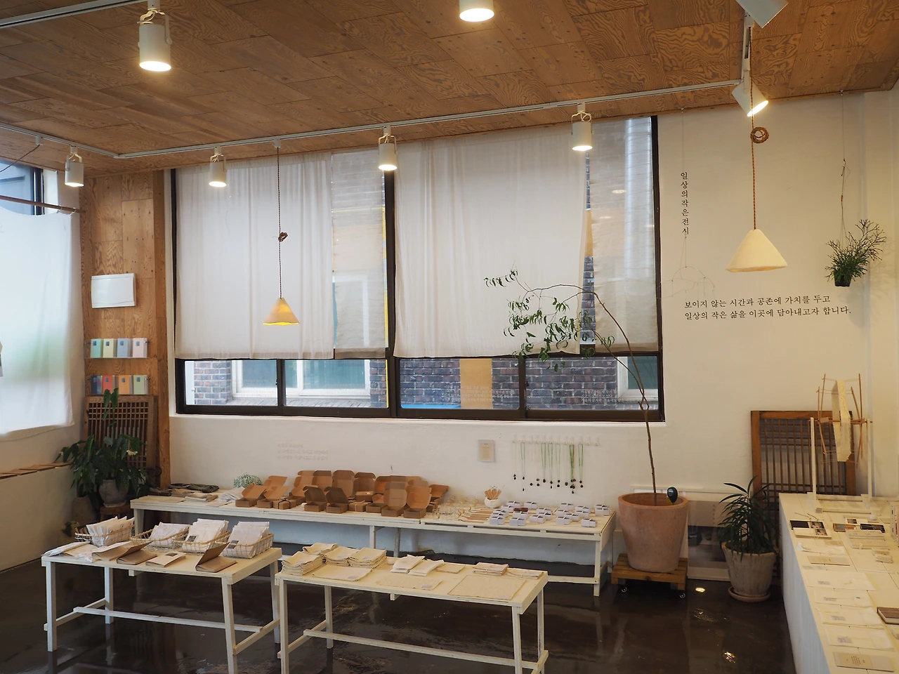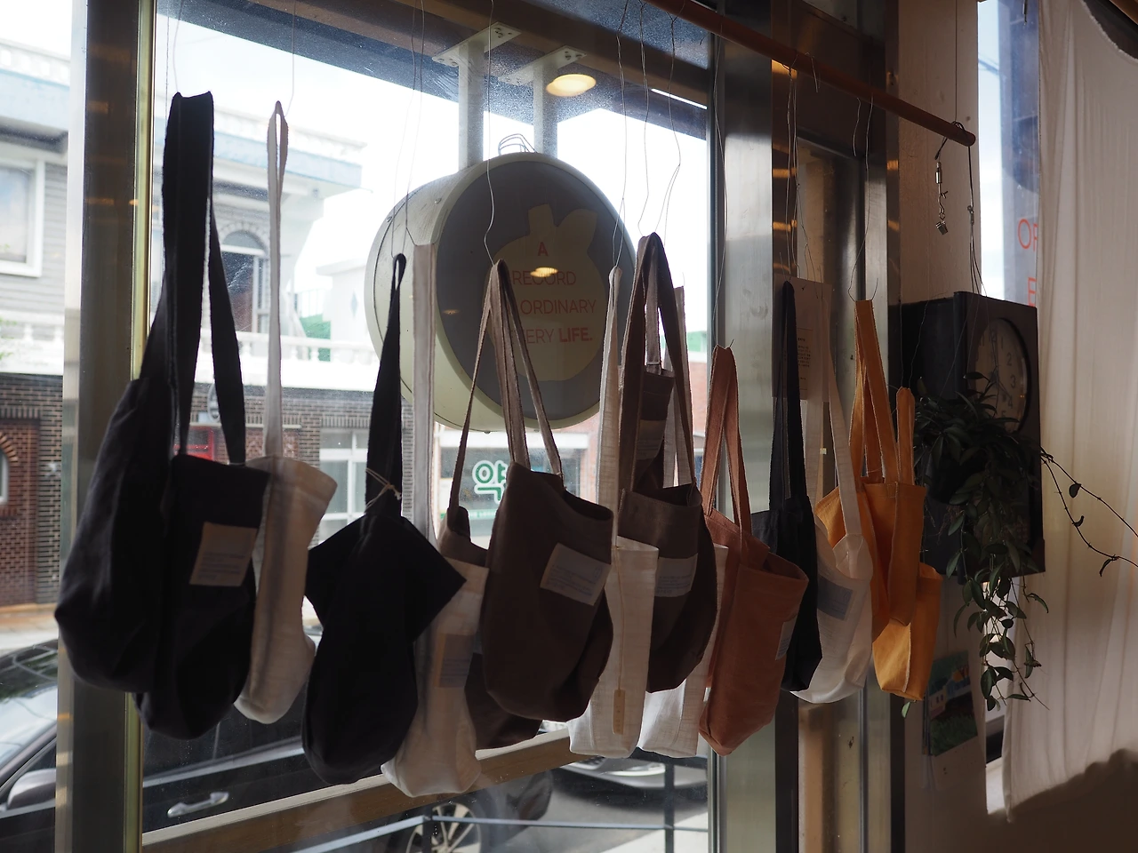 냉면 집에서 멀지 않은 곳에 지족마을이 있어 한 바퀴 돌아보기로 했다. 지난번에 왔을 때 닫힌 상점이 많아 아쉬웠는데, 오늘은 다행히 기록의 밭이 열려 있는 시간이었다. 기록의 밭은 기록을 정말 좋아하시는 사장님이 운영하시는 곳으로, 직접 만드신 여러 가지 소품을 판매한다. 알고 보니 지난번에 남쪽계절에서 구매한 1인용 피크닉 매트도 이곳의 제품이었다. 코스터, 수제노트, 매트, 보자기, 도시락 가방, 다이어리 등을 구매할 수 있다. 무엇보다 거의 모든 제품이 생분해성 소재나 자연소재로 만들어져 있다는 것이 눈에 띄었다. 자연상점이라는 말이 정말 잘 어울리는 곳이었다.