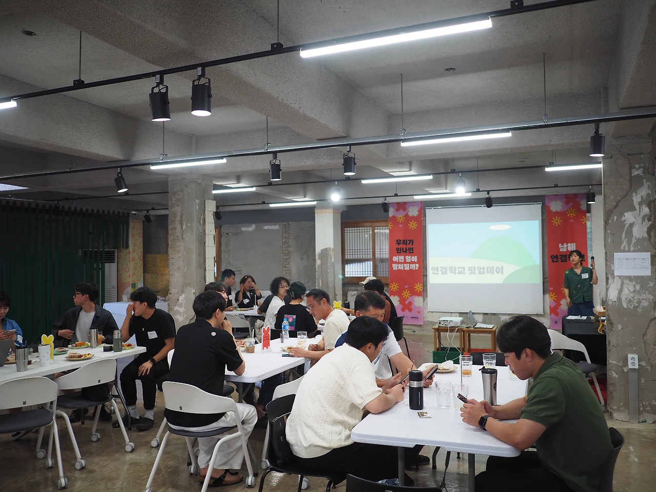 오늘 남해각에서는 특별한 행사가 있다. 남해의 소상공인들이 모여서 서로를 알아가고 소통하고, 사업에 대한 고민들을 풀어놓는 '연결학교'다. 남해관광문화재단과 카카카가 함께 만든 자리다. 마침 만나고 싶었던 예비 인터뷰이들이 대부분 와계셔서, 서로의 고민을 나누는 동안 이들의 이야기를 자세히 들을 수 있었다. 며칠 남지 않은 남해에서의 시간 동안 인터뷰할 수 있도록 약속도 많이 잡았다. 감사한 일이다. 그동안 인터뷰하며 만났던 분들, 식당에서 만났던 사장님들, 오며 가며 카페에서 만났던 분들, 가보았던 공간에서 일하시는 분들을 많이 만났다. 군에서 이렇게 적극적으로 즐겁게 서로 소통할 수 있는 자리를 만들어줘서 정말 좋았다. 오신 분들 모두 시간 가는 게 아쉬울 정도로 이야기꽃을 활짝 피웠다.