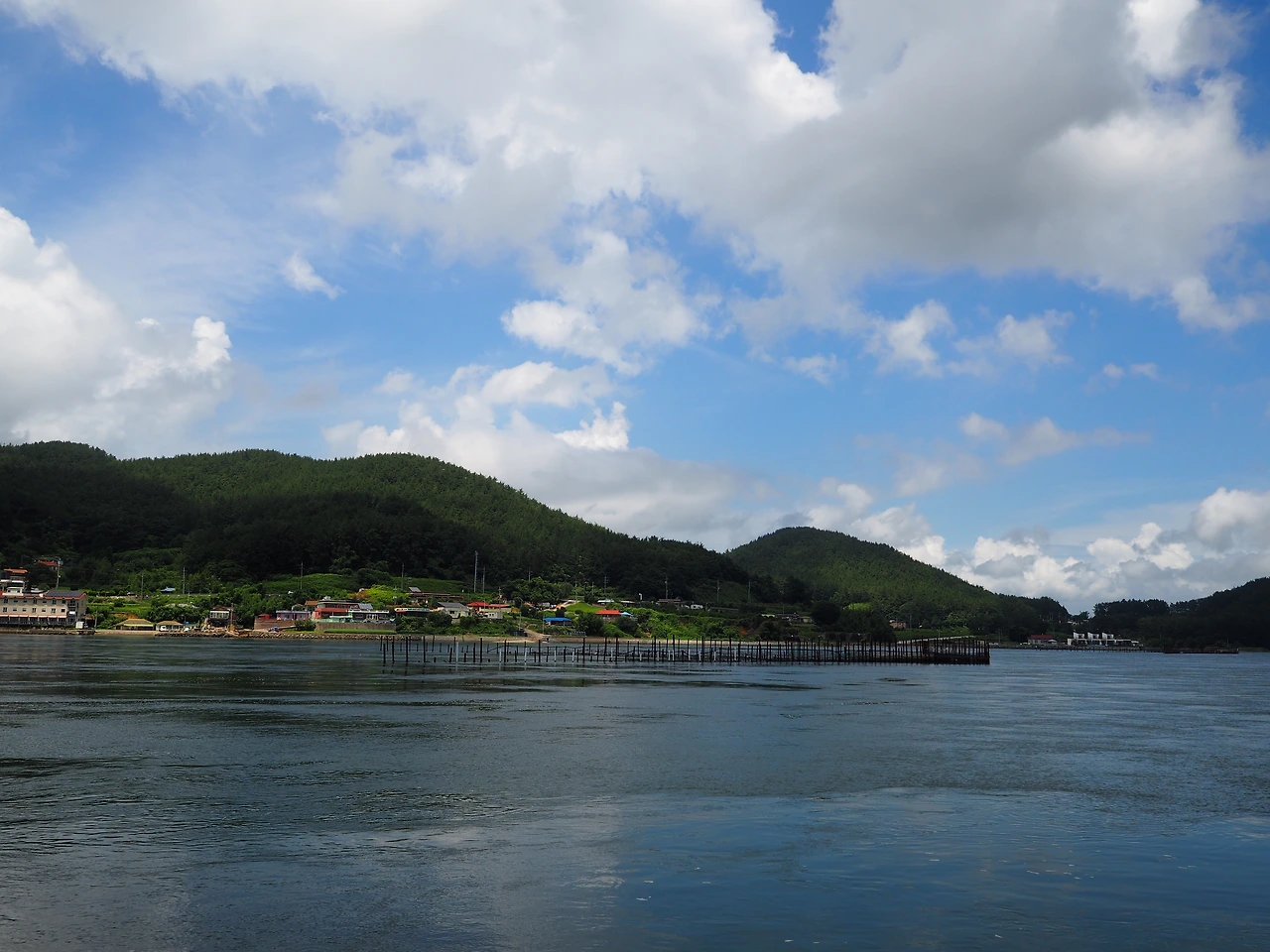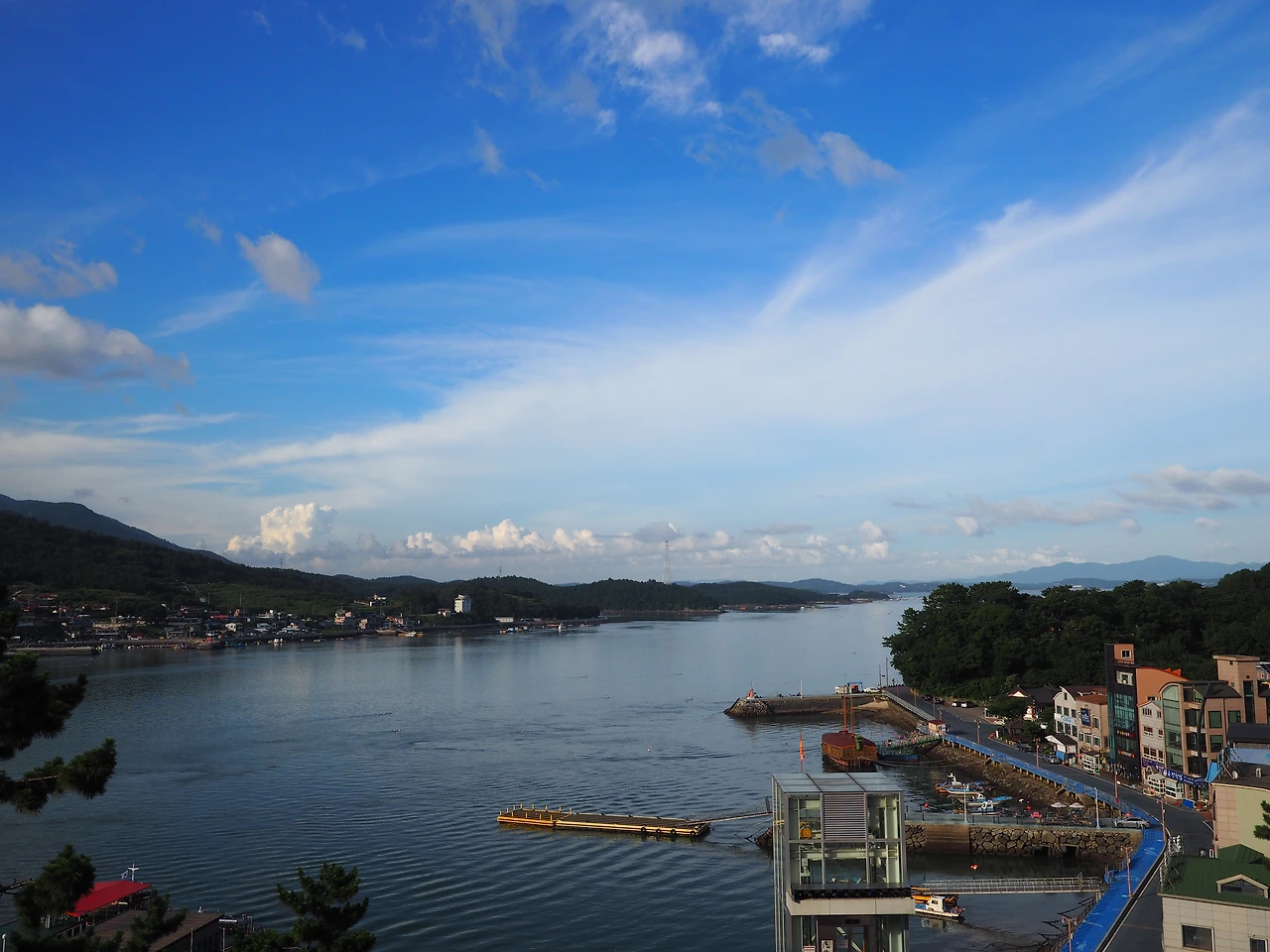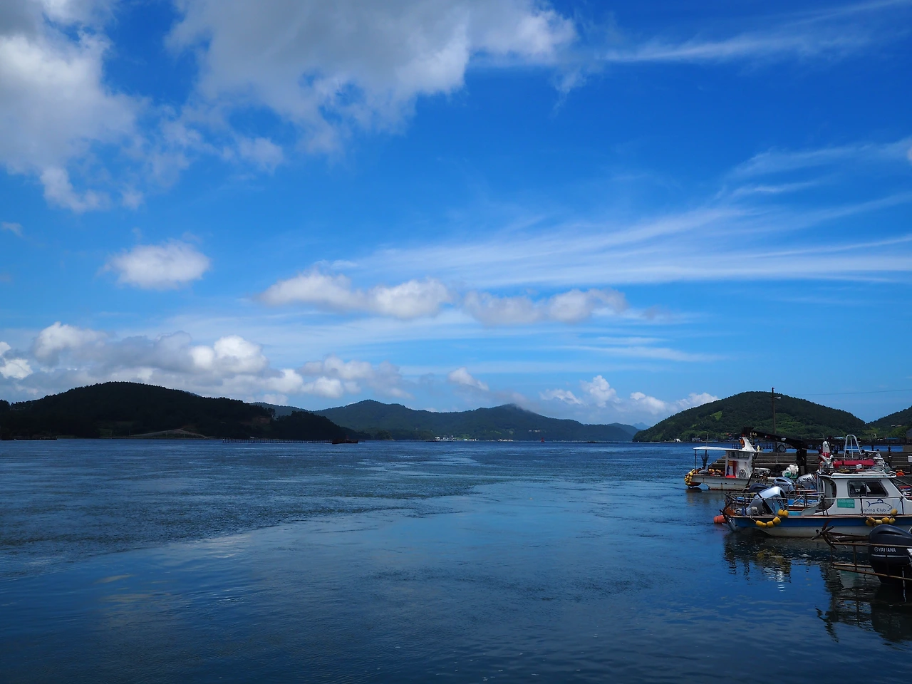 지족마을까지 와서 죽방렴을 안 볼 수는 없지. 다시 차에 타서 2분 만에 바닷가에 도착했다. 아까 테라스에서 나던 바다 내음이 더욱 진하게 차로 파고든다. 보기 드문 파란 하늘에 가슴도 뻥 뚫리는 듯하다. 바다 한가운데에 대나무로 만든 전통 방식의 죽방렴이 자리 잡고 있다. 죽방렴으로 잡은 죽방멸치는 비늘이 많이 상하지 않고, 맛도 훨씬 좋다고 한다. 바닷가를 따라 늘어선 어선들이 이곳이 어촌마을임을 보여주고 있다. 뙤약볕에 아랑곳하지 않고 부둣가에 서서 담소를 나누는 어르신 두 분에게서, 바다를 평생 상대한 강인함이 느껴진다.