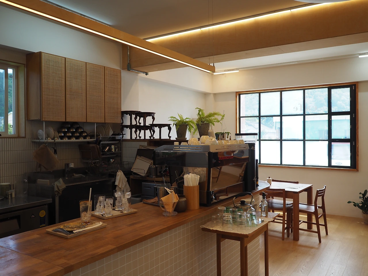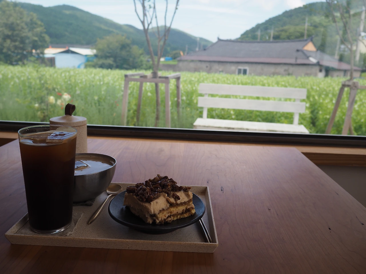 아쉽게도 지금 진행되는 전시는 없었지만, 카페와 스튜디오 공간을 한껏 즐기다 나왔다. 카페는 창문마다 아름다운 정원을 바라보고 있어 어느 자리에 앉을지부터 설레하며 골랐다. 우리가 고른 자리는 흰색 벤치 뒤로 참깨밭의 흰색 꽃이 흐드러지게 핀 구석 자리였다. 아메리카노 한 잔과 미숫가루 한 잔, 그리고 달달한 피칸이 올라간 미수티라를 하나 시켰다. 미숫가루는 돌창고가 처음에 열었을 때부터 대접하던 것으로, 지금은 남해에서 난 겉보리, 노란 콩, 현미, 찹쌀을 이용해 만든다고 한다. 달달하고 진한 맛이다. 고소한 미수티라는 묘하게 손이 계속 간다. 지역의 식재료를 사용한 상품들이 눈에 띈다.
