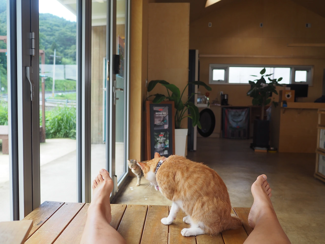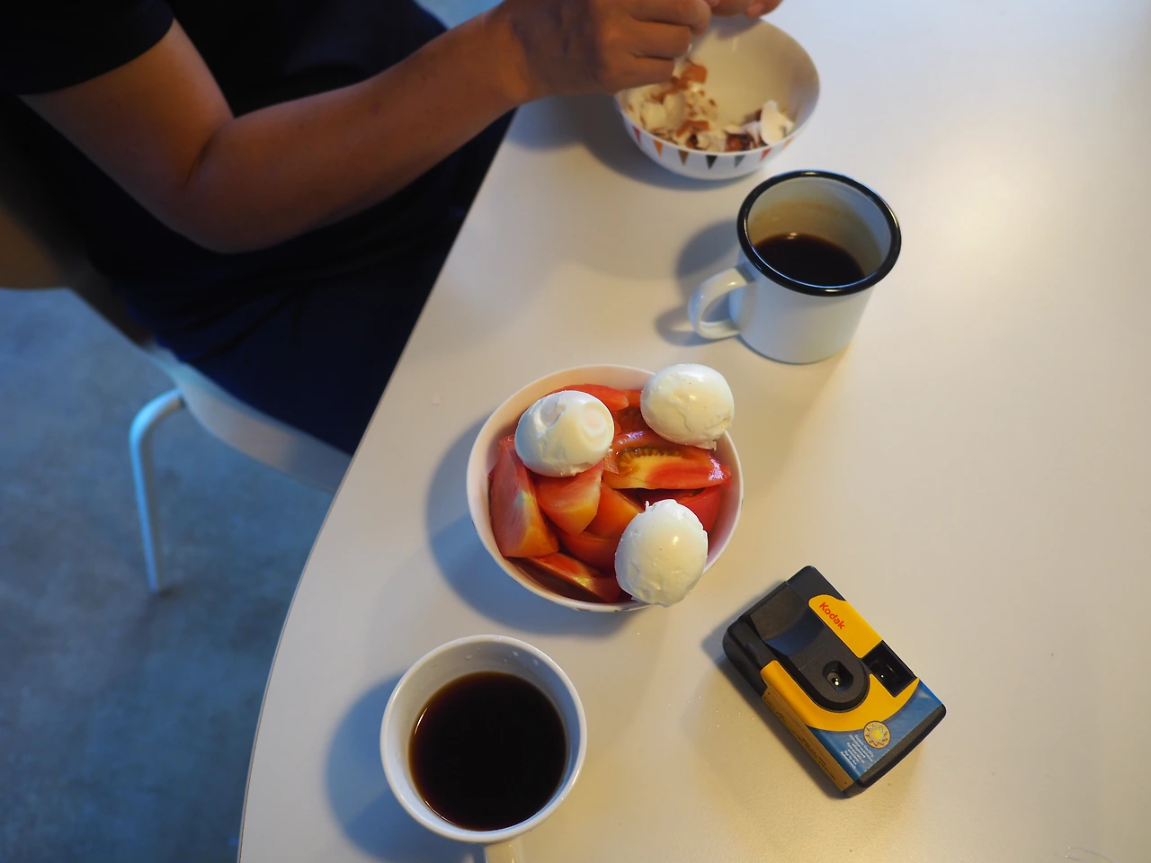 원래는 동네 언니와 했던 것처럼 아이스박스에 아침 식사거리를 챙겨 나와 당산나무 밑에서 먹으려고 했는데, 아침부터 볕이 너무 강하고 습해서 도무지 밖에서 먹을 날씨가 아니다. 결국 라운지로 들어와서 삶은 달걀과 토마토를 먹고 디카페인 커피를 마셨다. 시간이 맞지 않아 팜프라의 두모사진관을 이용하진 못했지만(사진을 전공하신 린지 님이 직접 당산나무 밑에서 찍어주시는 서비스다), 추억 기록용으로 가져온 일회용 카메라로 엄마를 찍어드리기로 했다. 일단은 빨래부터. 세탁기와 건조기를 기다리는 시간이 길었는지 엄마는 잠깐 다시 누우러 방에 가신단다. 비밀번호를 알려드리고 나는 빨래를 기다릴 겸 평상에 누웠다. 인절미가 슬그머니 와서 다리 사이에 자리를 잡고 그루밍을 한다.